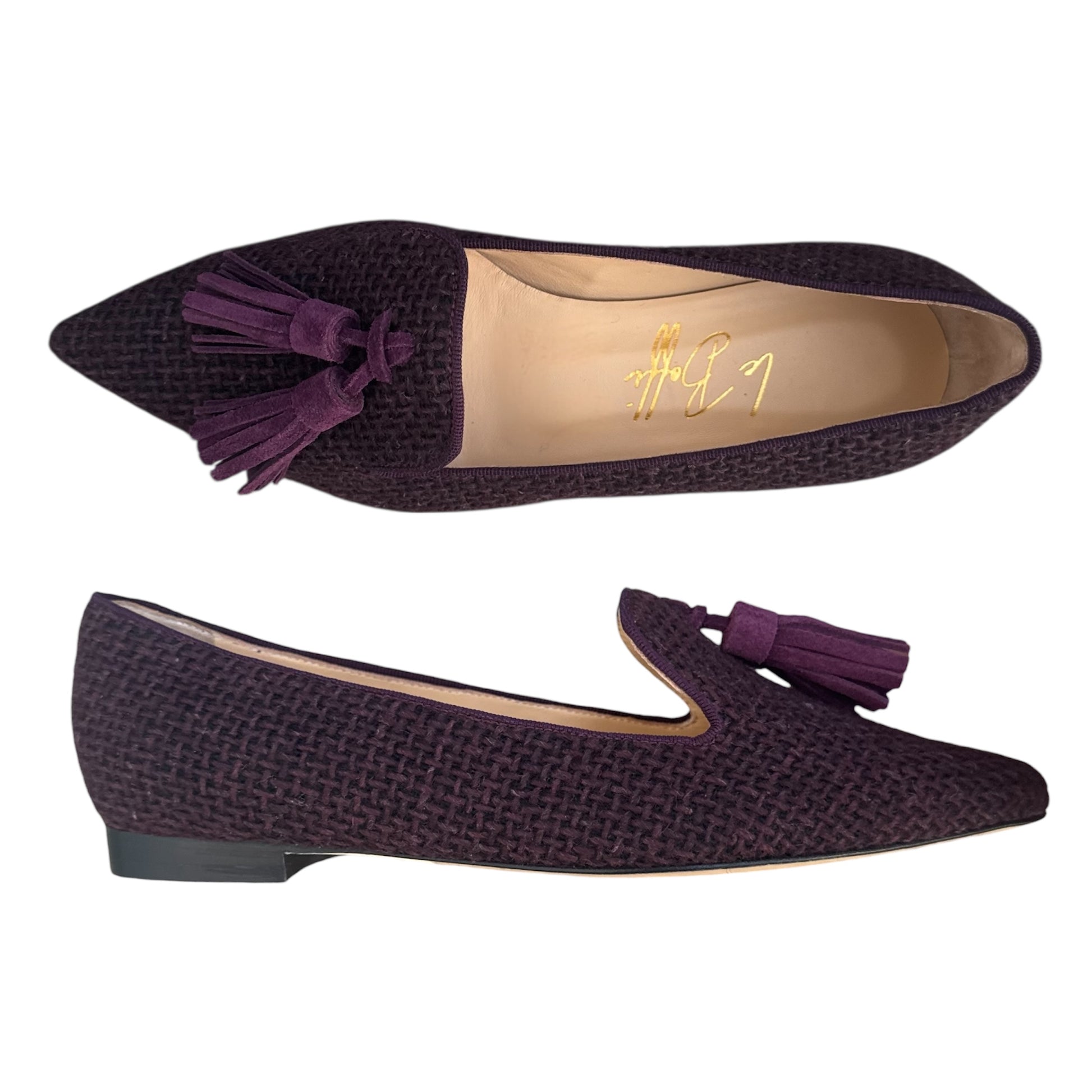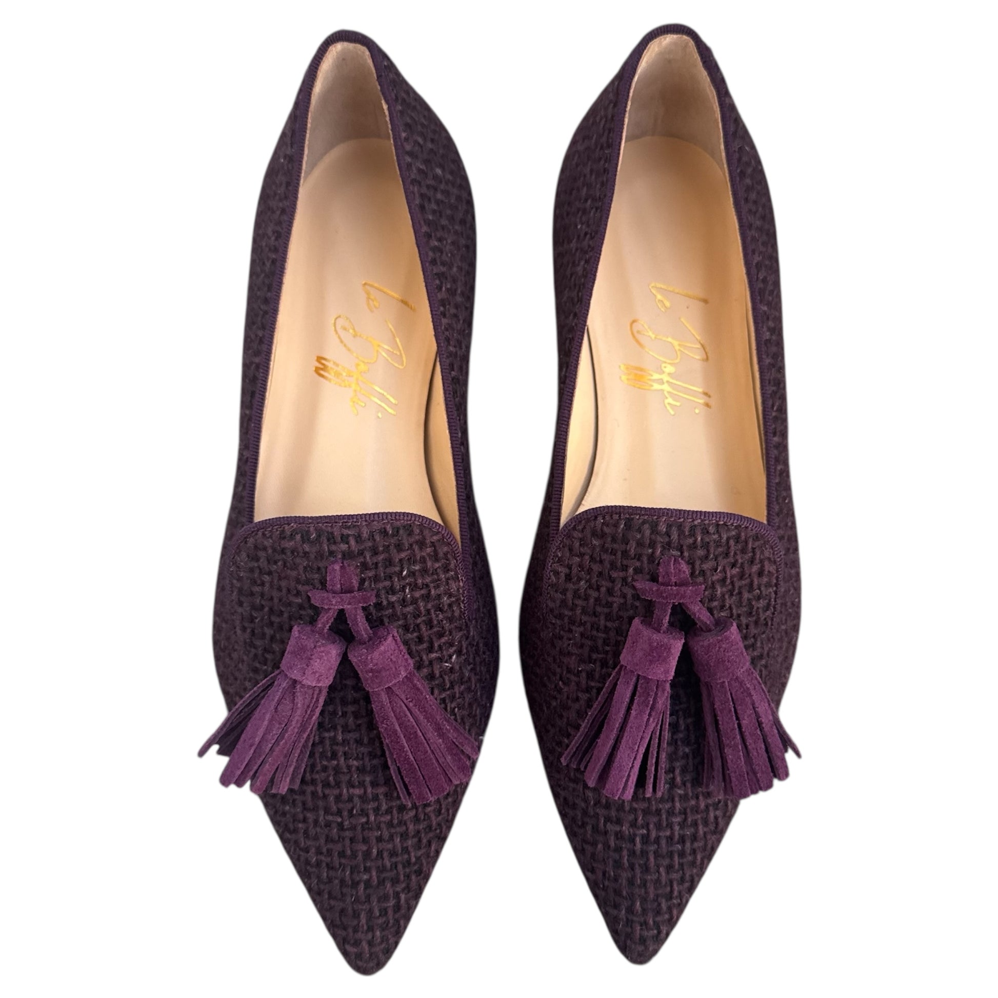 Mocassino a punta in bouclé prugna e nappine in camoscio