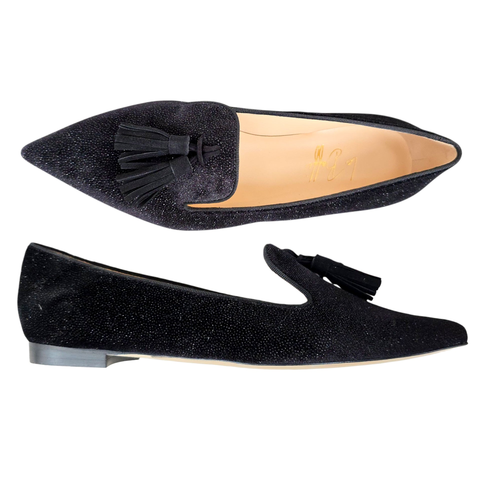 Mocassino a punta in velluto leggermente glitterato e nappine in camoscio nero