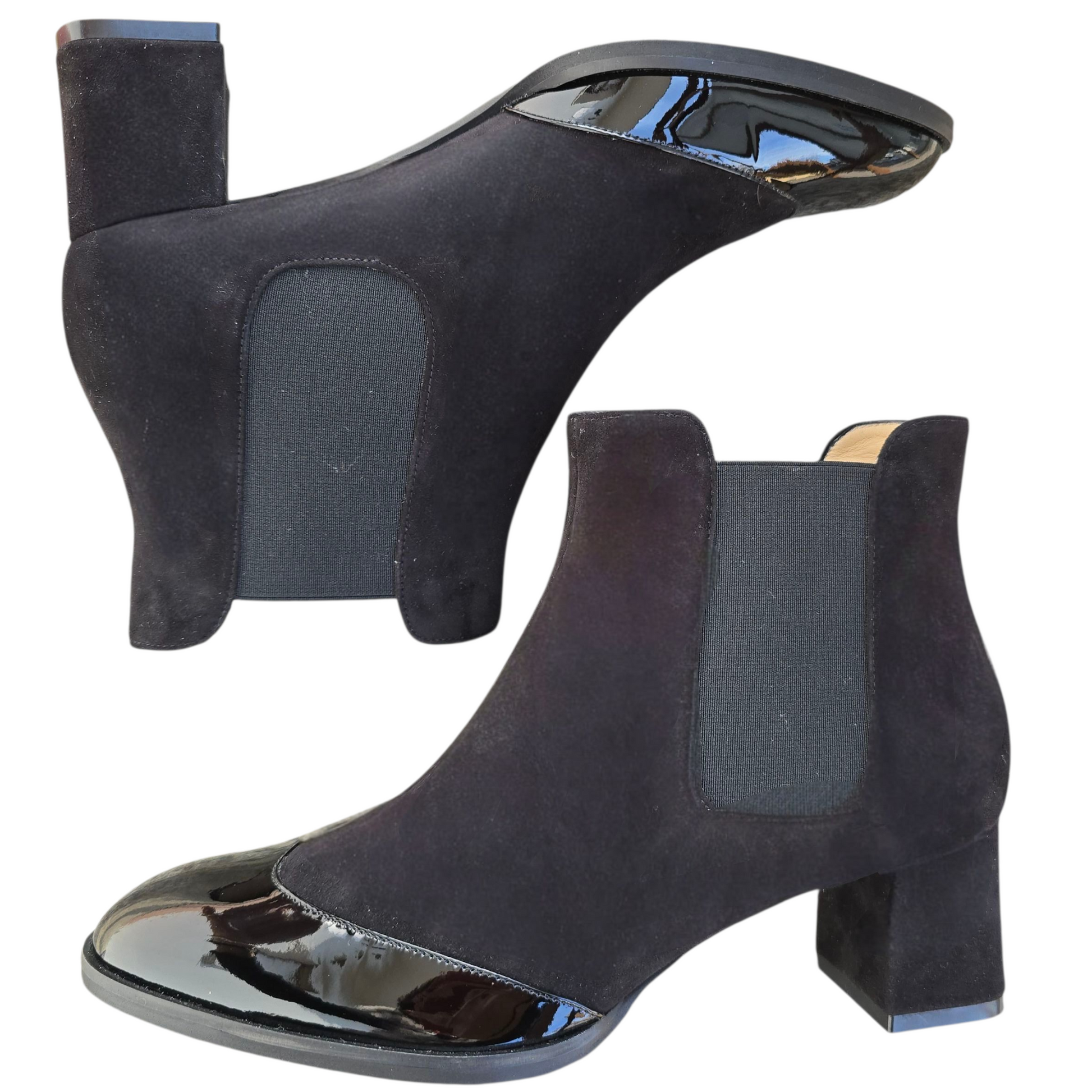 Tronchetto a punta tonda in camoscio nero e punta in vernice nera - suola in gomma