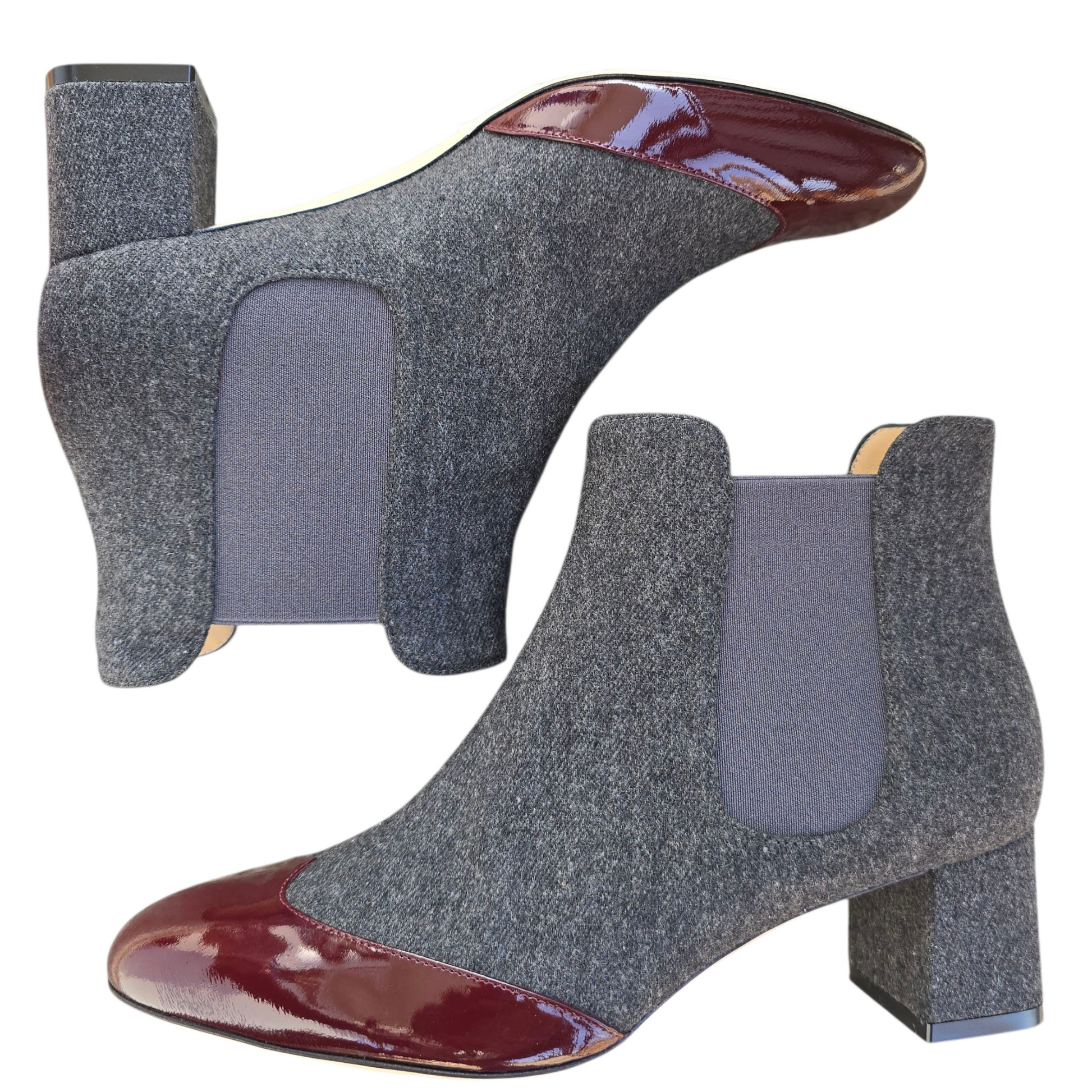 Tronchetto a punta tonda in lana grigia con punta in vernice bordeaux