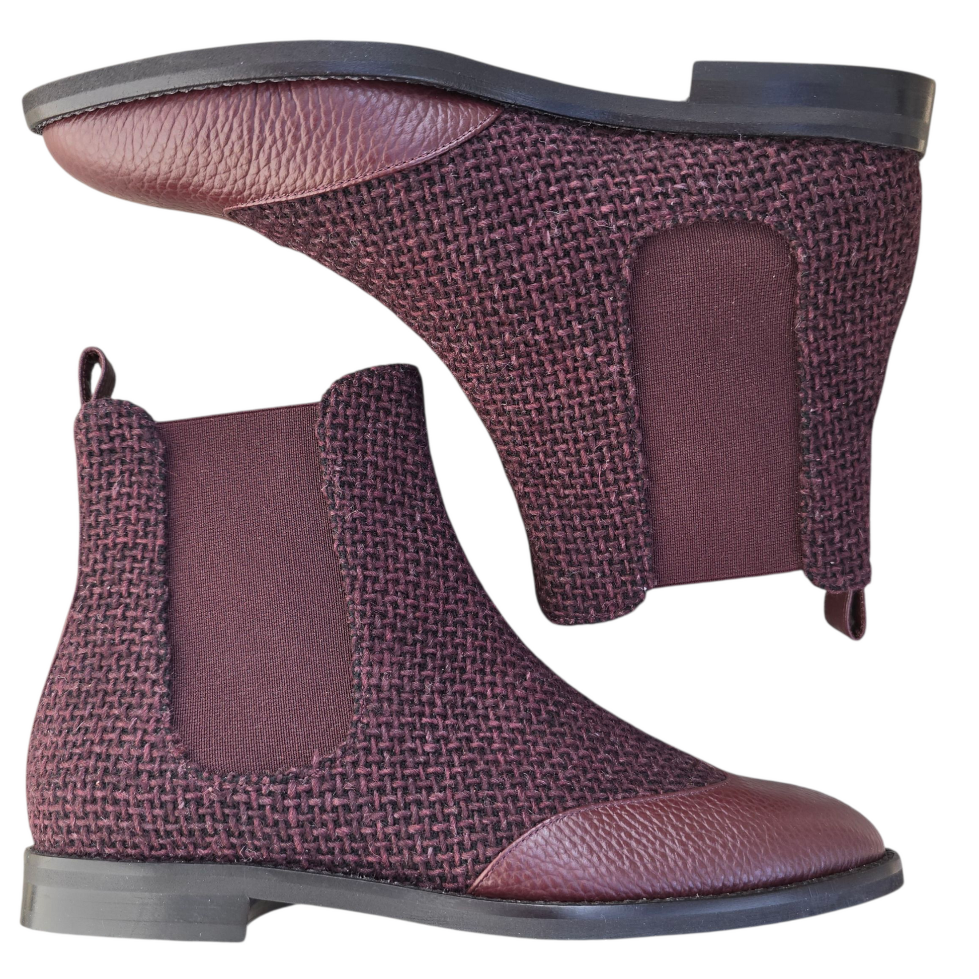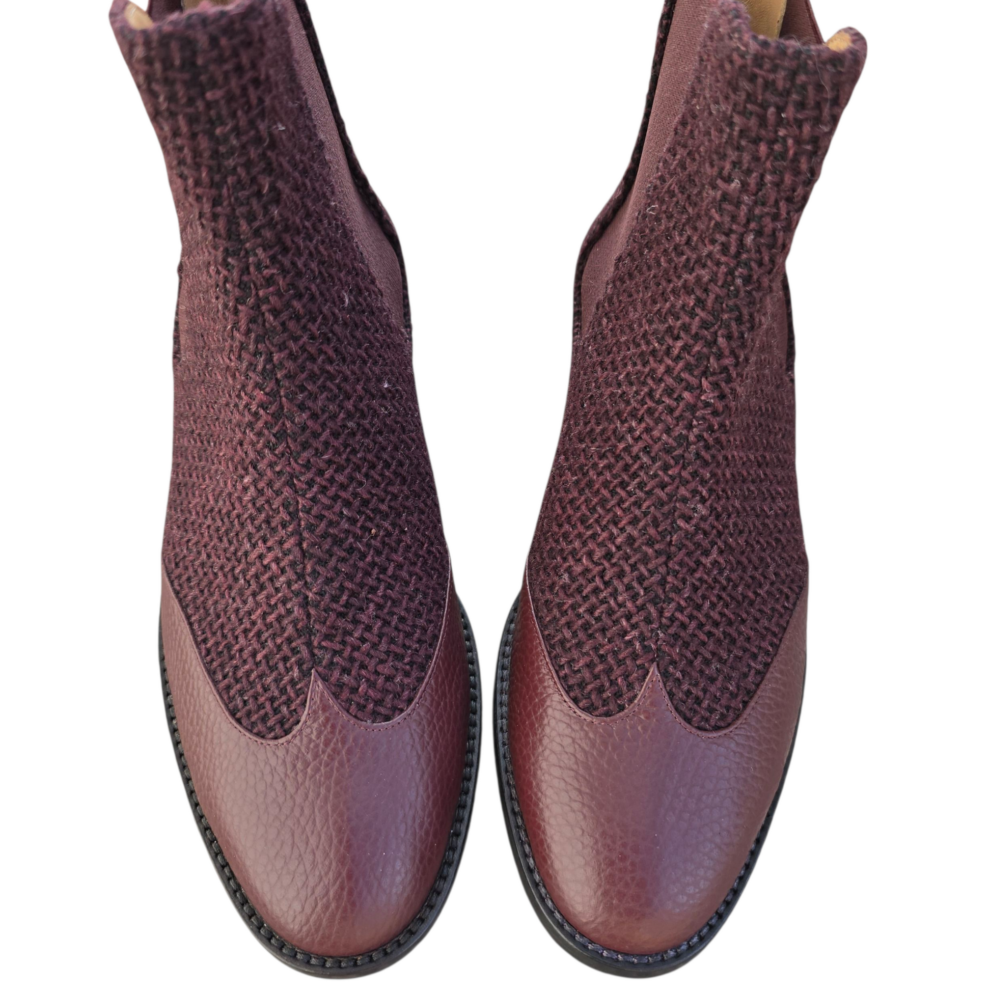 Beatles con suola in gomma ed elastico laterale in bouclè prugna con punta in pelle martellata prugna