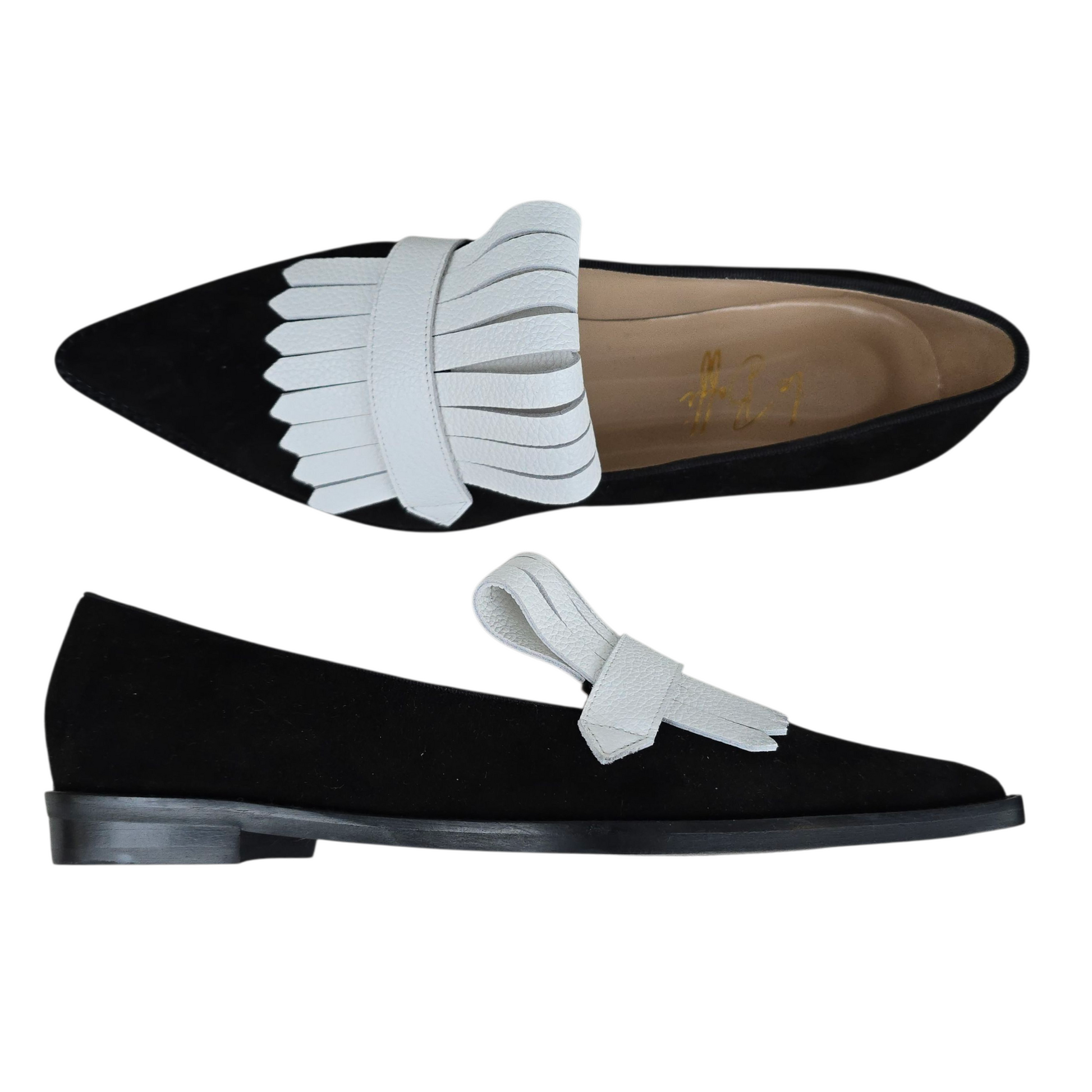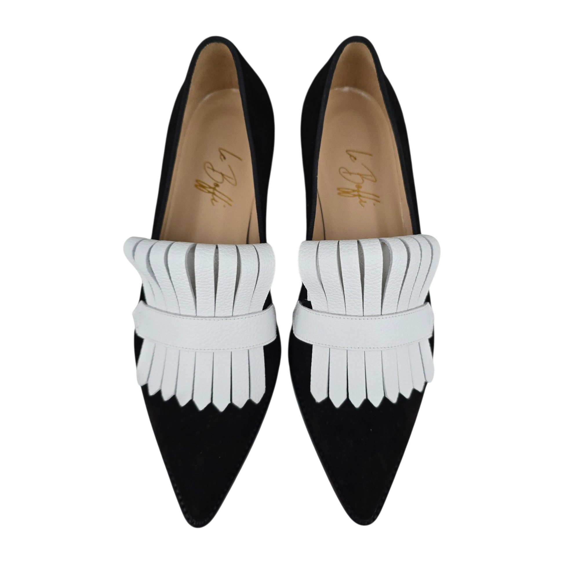 Mocassino in camoscio nero e frangia in pelle martellata bianca, con suola in gomma