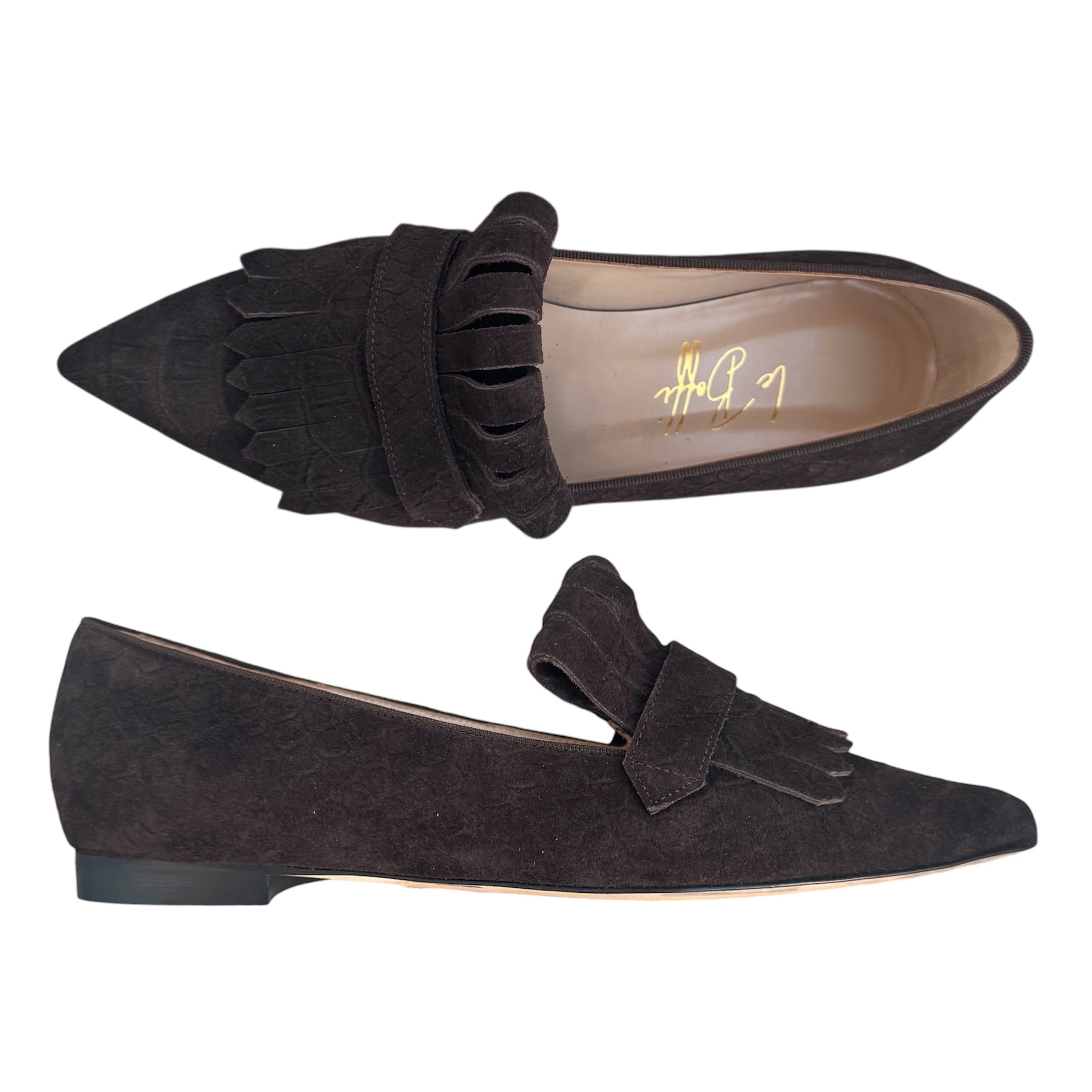Mocassino a punta con frangia in camoscio color cioccolato, stampa cocco