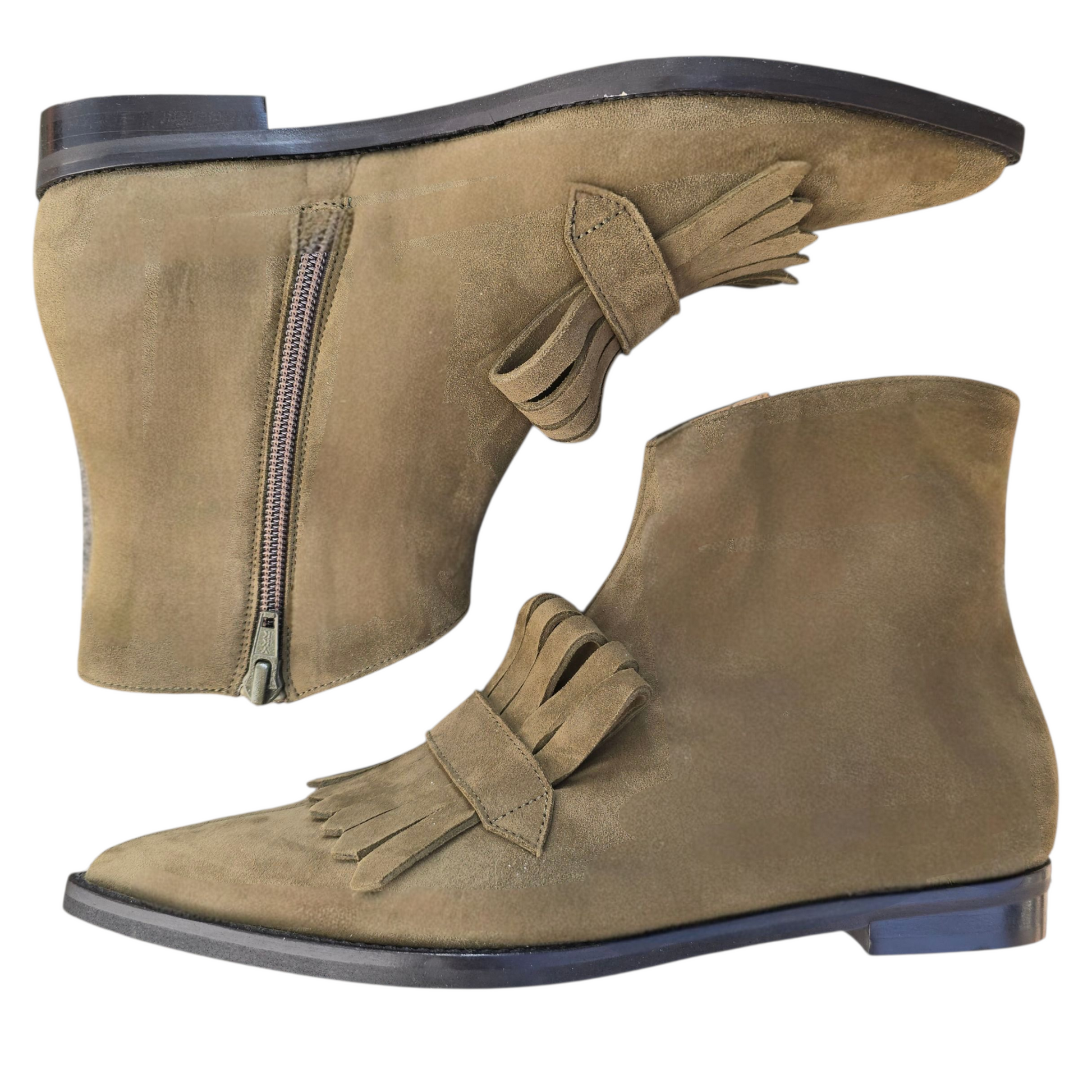 Stivaletto flat a punta con frangia, suola in gomma in camoscio verde oliva