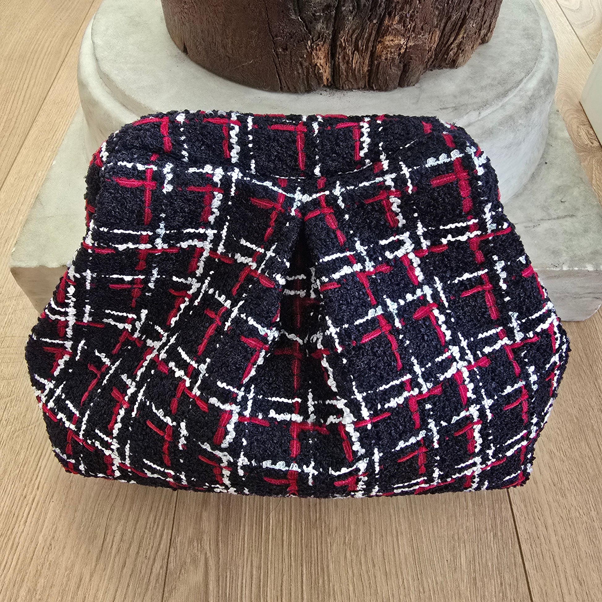 Boffina bag dimensione grande, in bouclè a fondo blu, con check bianco e ciliegia