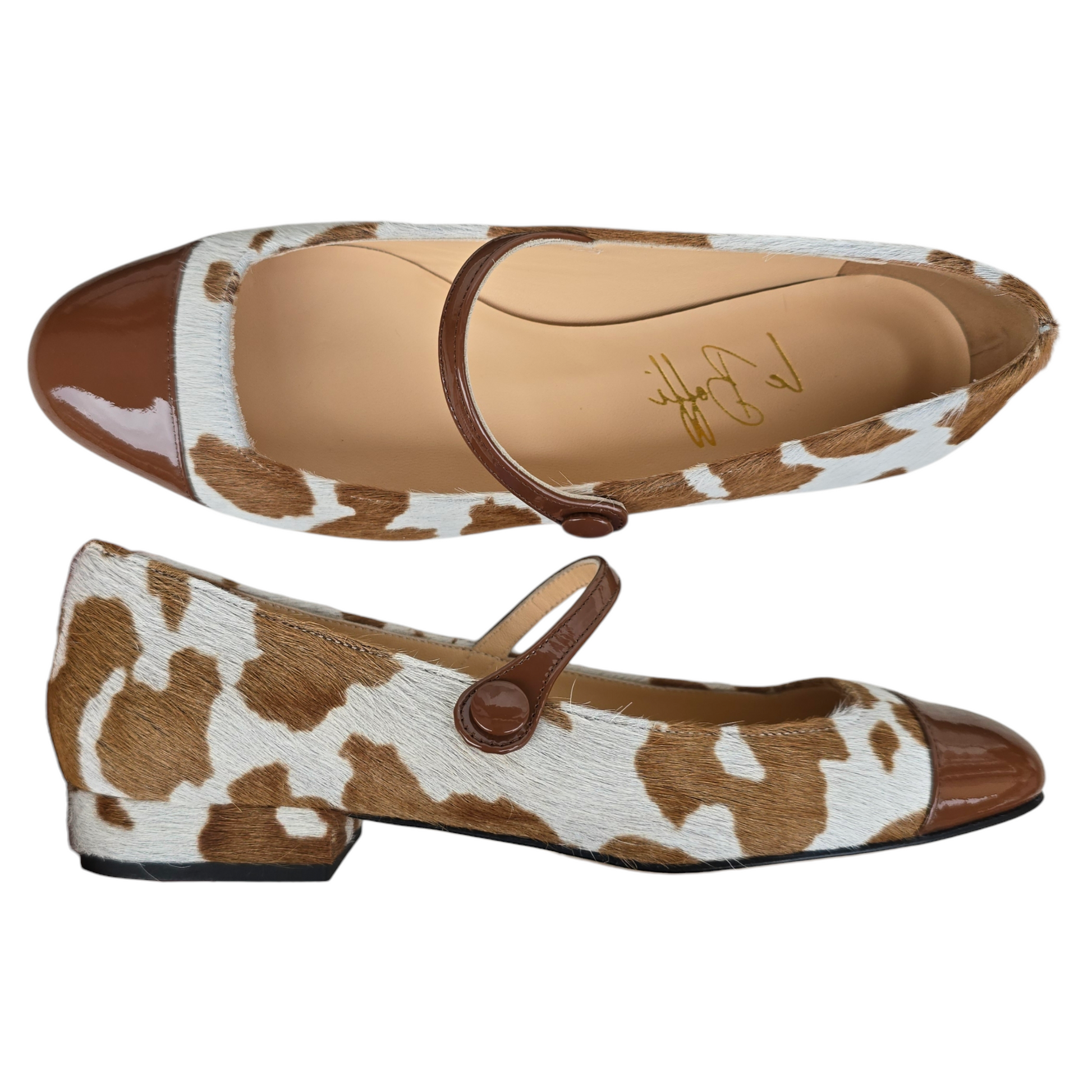 Maryjane tonda in cavallino stampa mucca e dettagli in vernice caramello