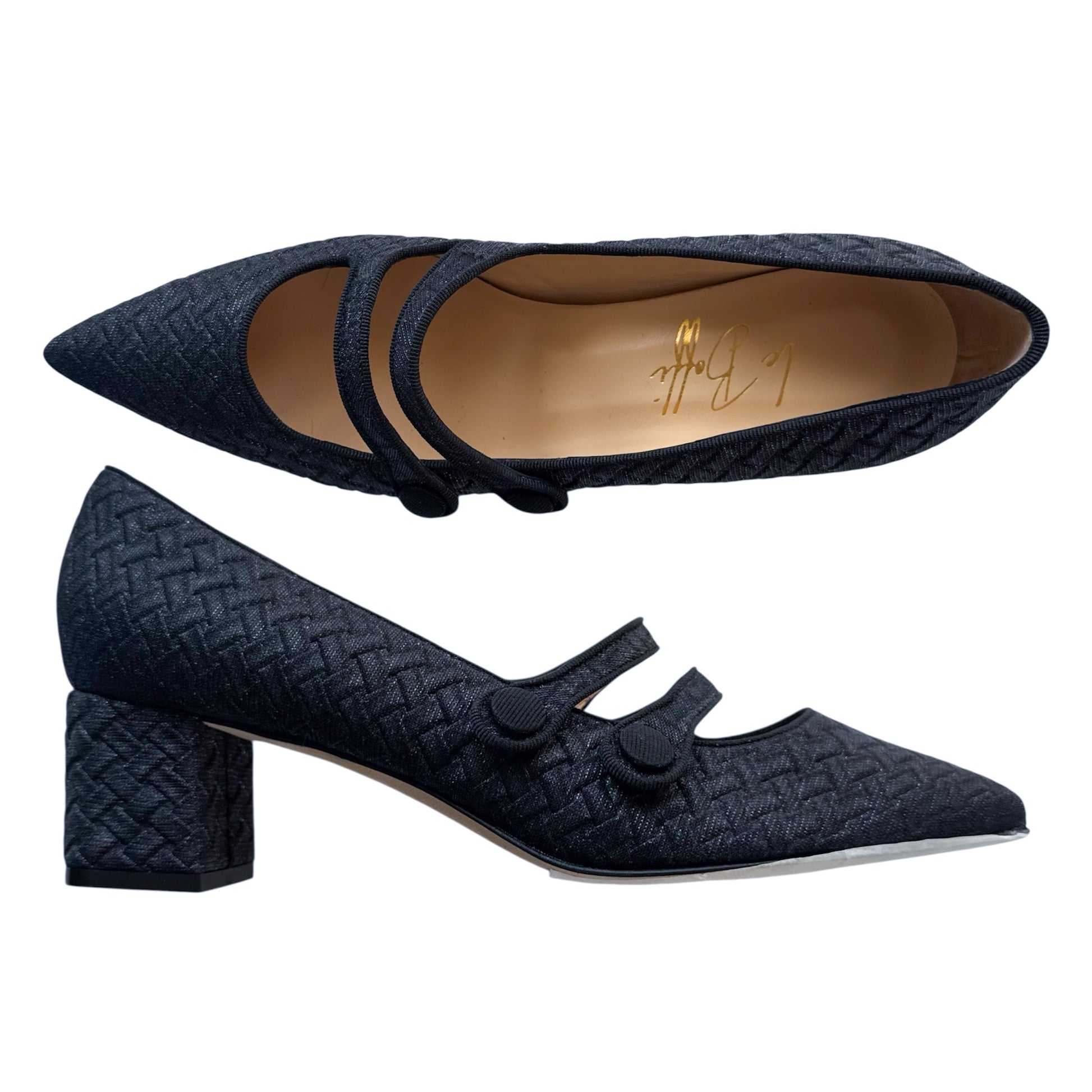Décolleté con doppio listino in tessuto intrecciato e leggermente glitterato, con tacco quadrato