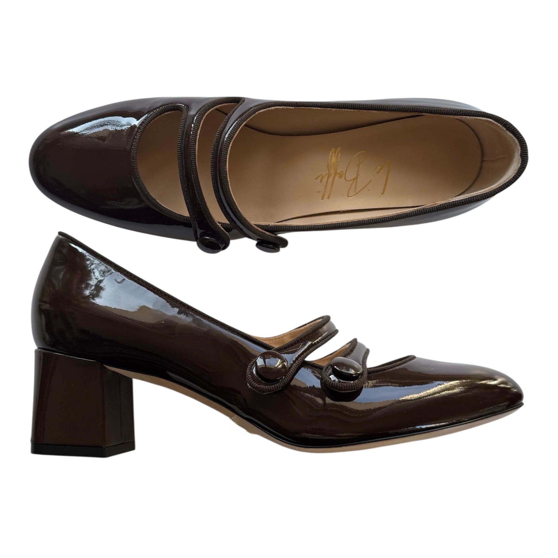 Ballerina a punta tonda in vernice color cioccolato, tacco 5 cm quadrato