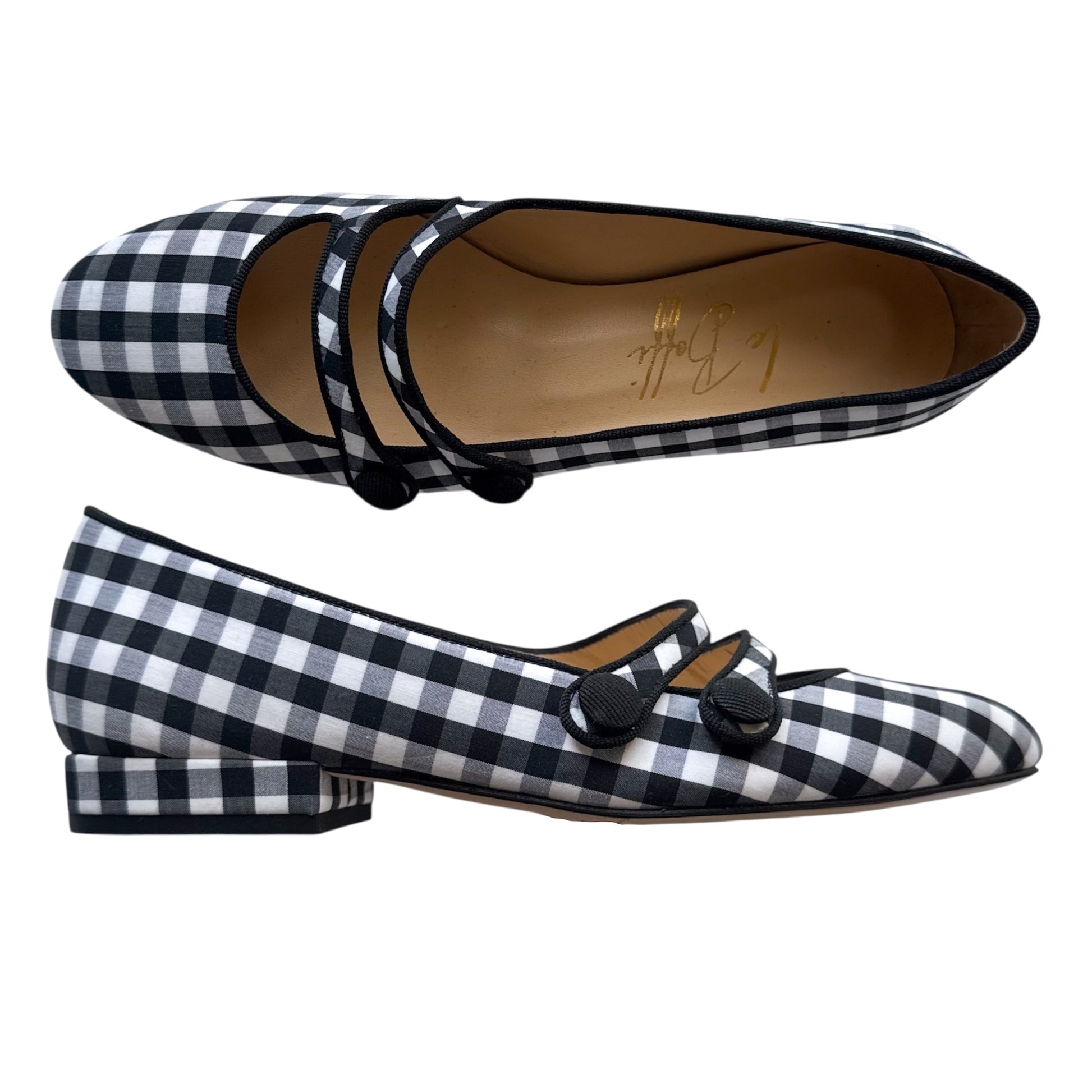 Ballerina a punta tonda in tessuto vichy bianco e nero