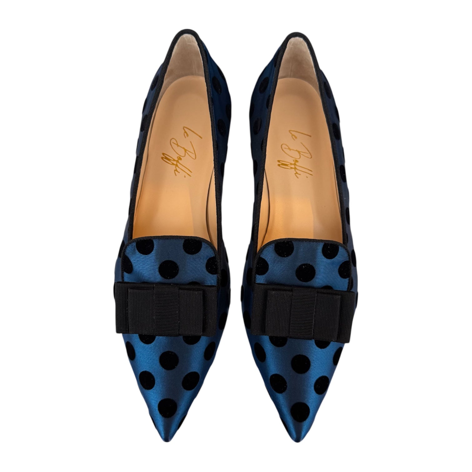 Mocassino a punta in tessuto bluette con pois in velluto nero