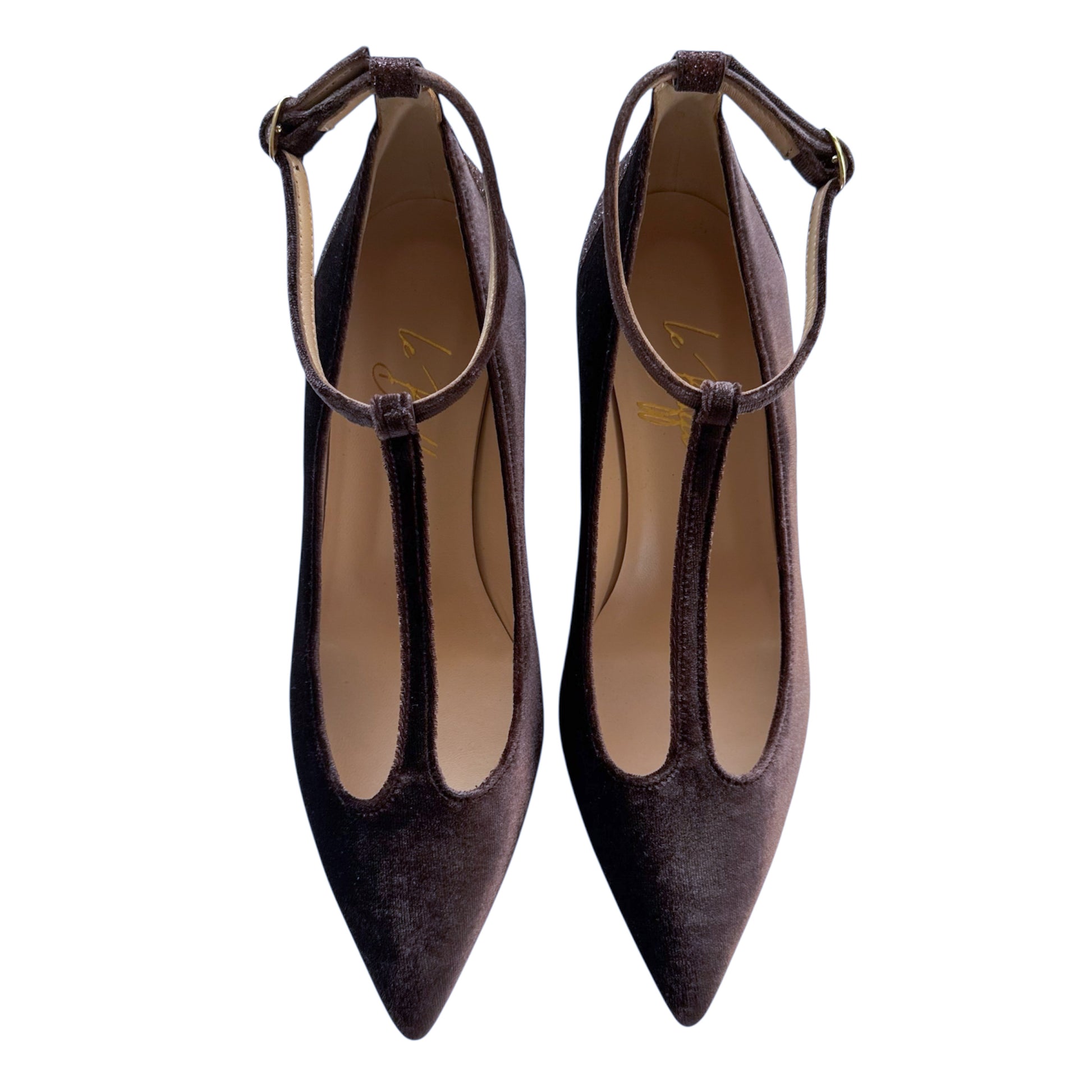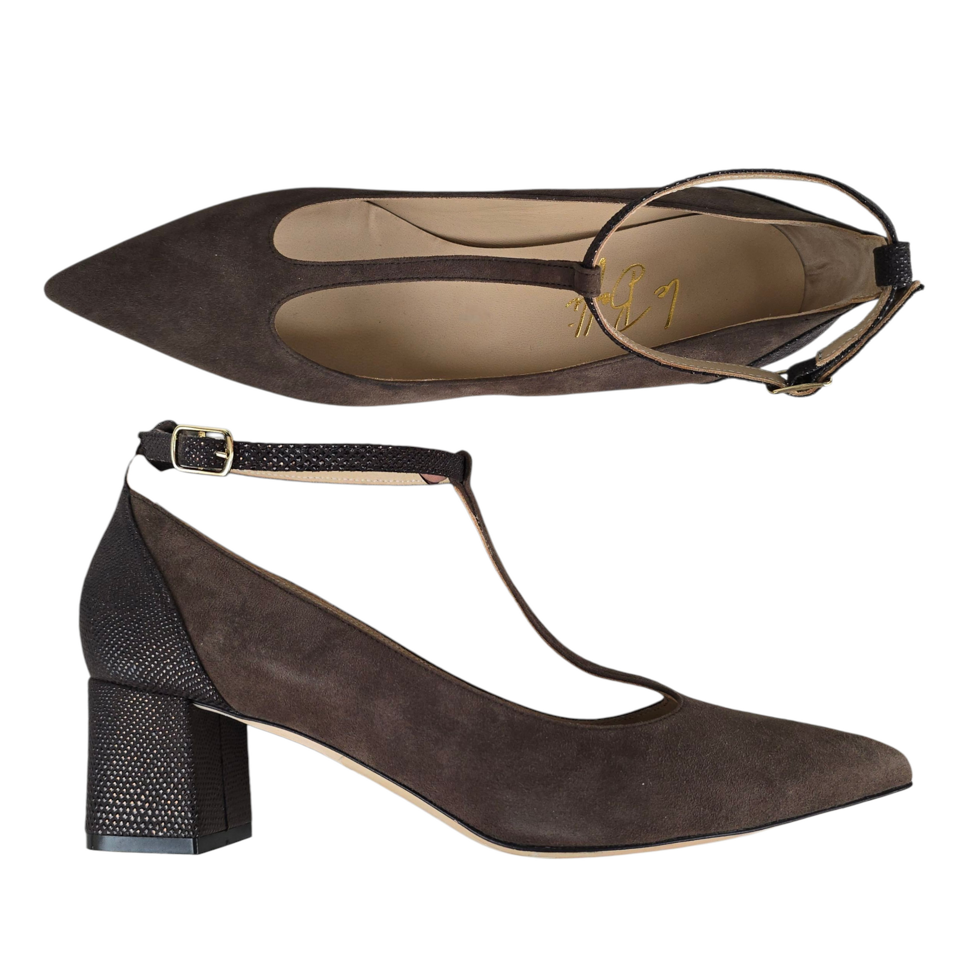 Ballerina a punta modello Tbar in camoscio tabacco con tallone e tacco in tessuto lavorato a pois, tacco 5 cm quadrato
