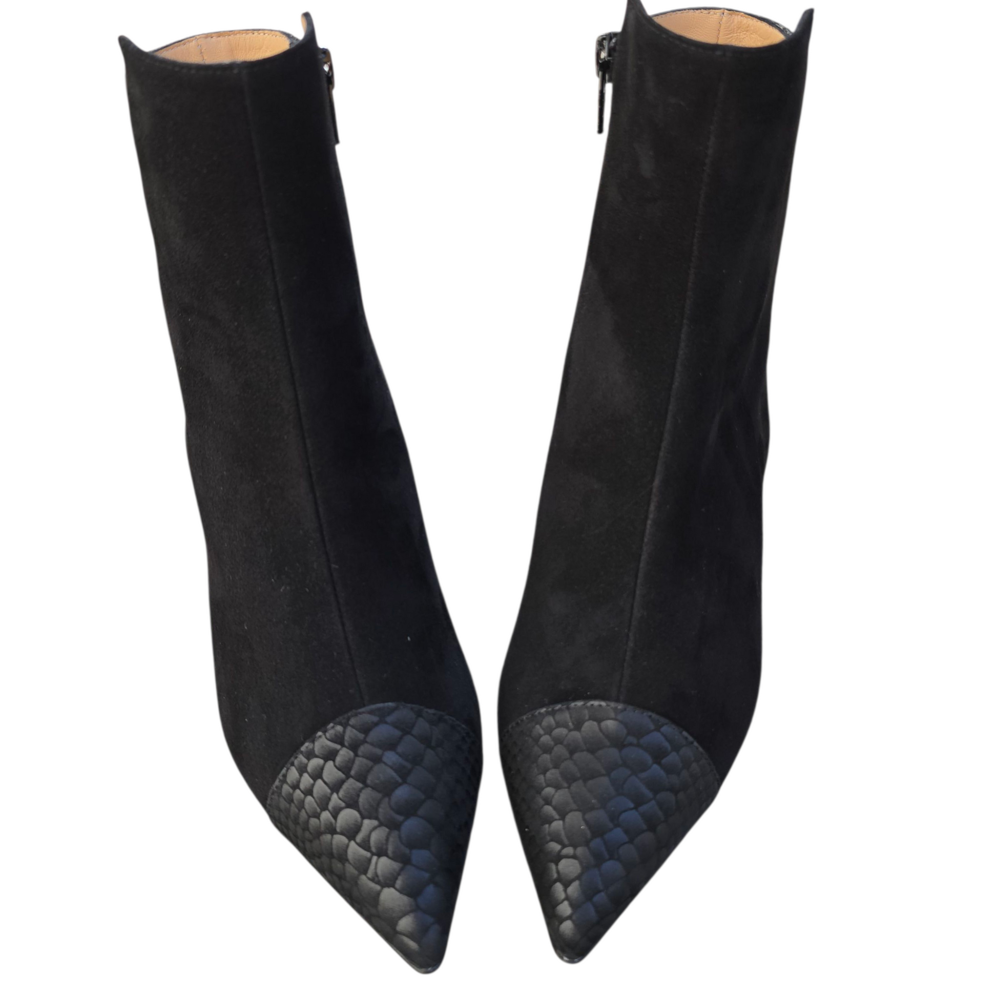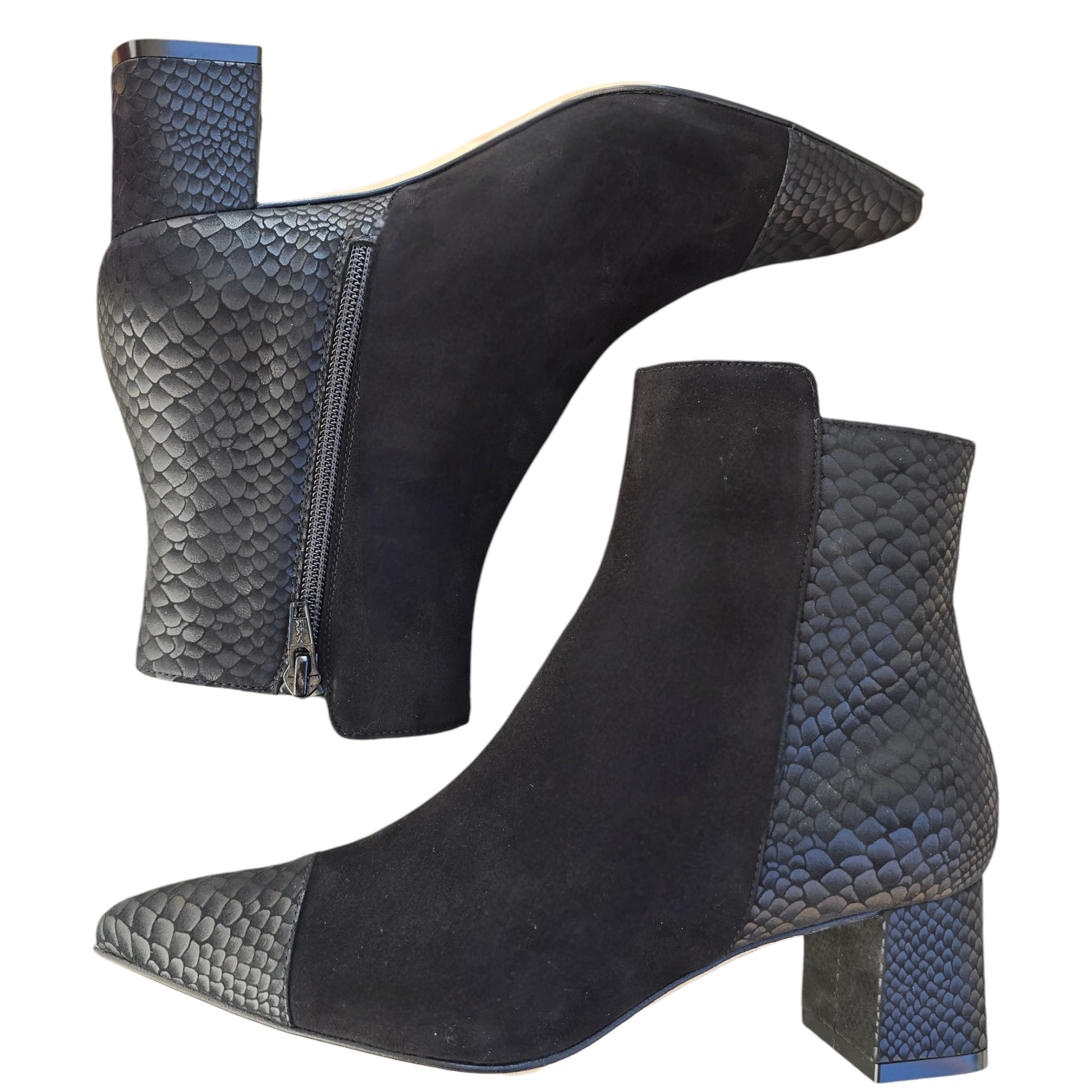 Tronchetto a punta in camoscio nero e camoscio stampata rettile nero