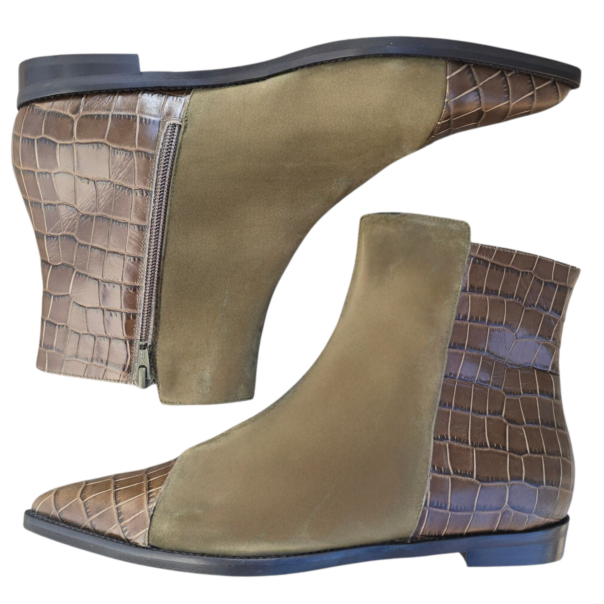 Stivaletto flat a punta con suola in gomma in camoscio oliva con punta e retro in pelle stampa cocco in tinta
