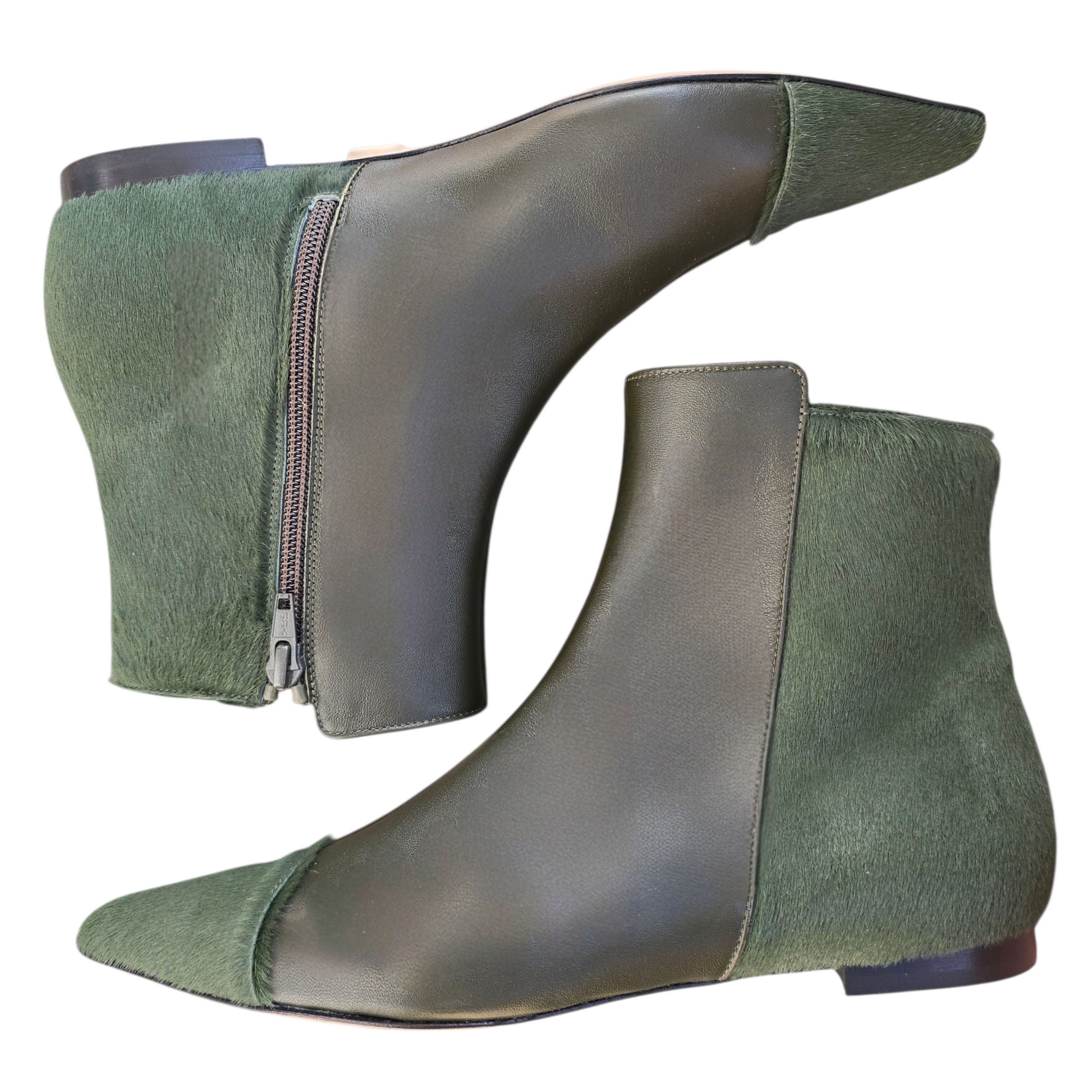 Stivaletto flat a punta in pelle verde oliva con punta e retro in cavallino verde in tinta