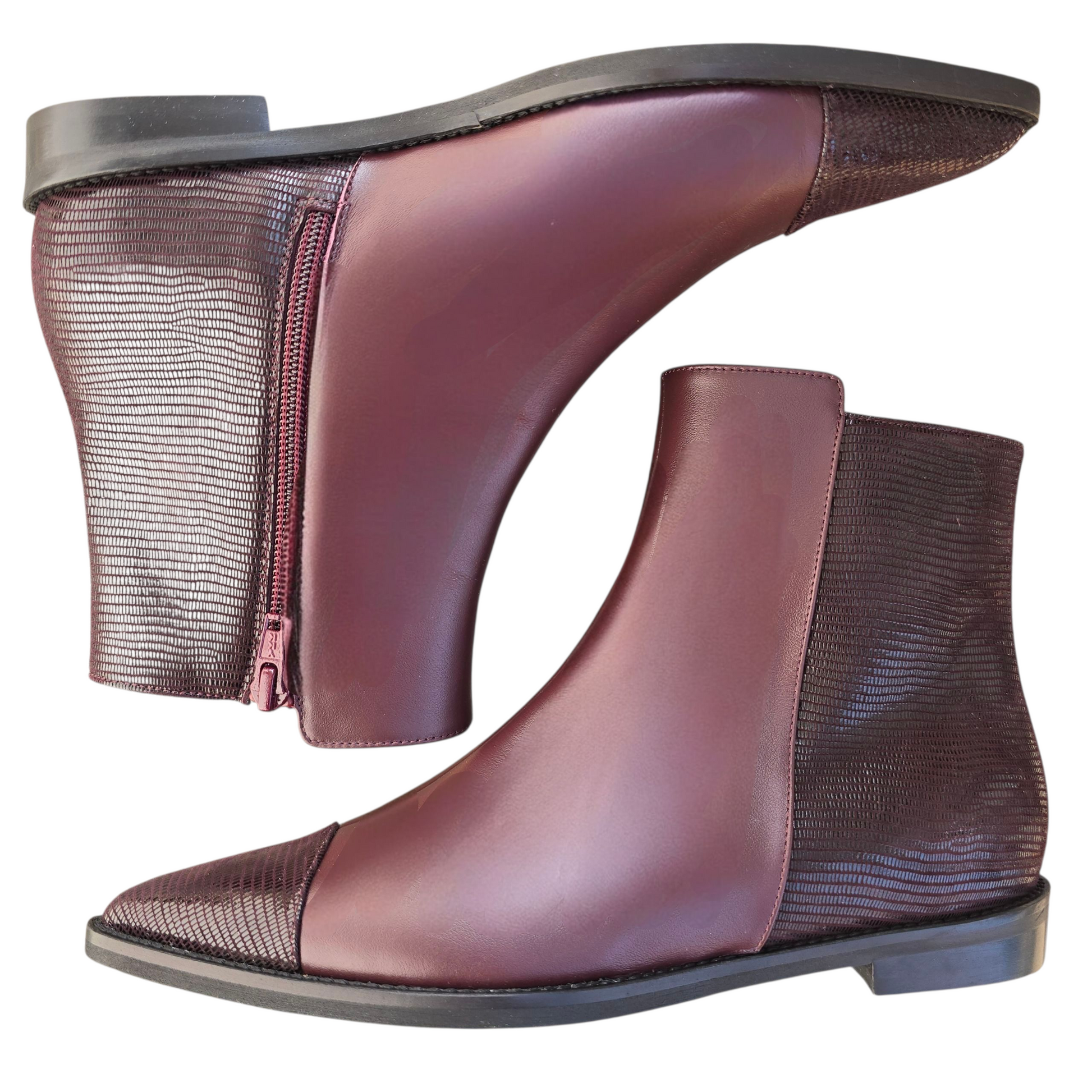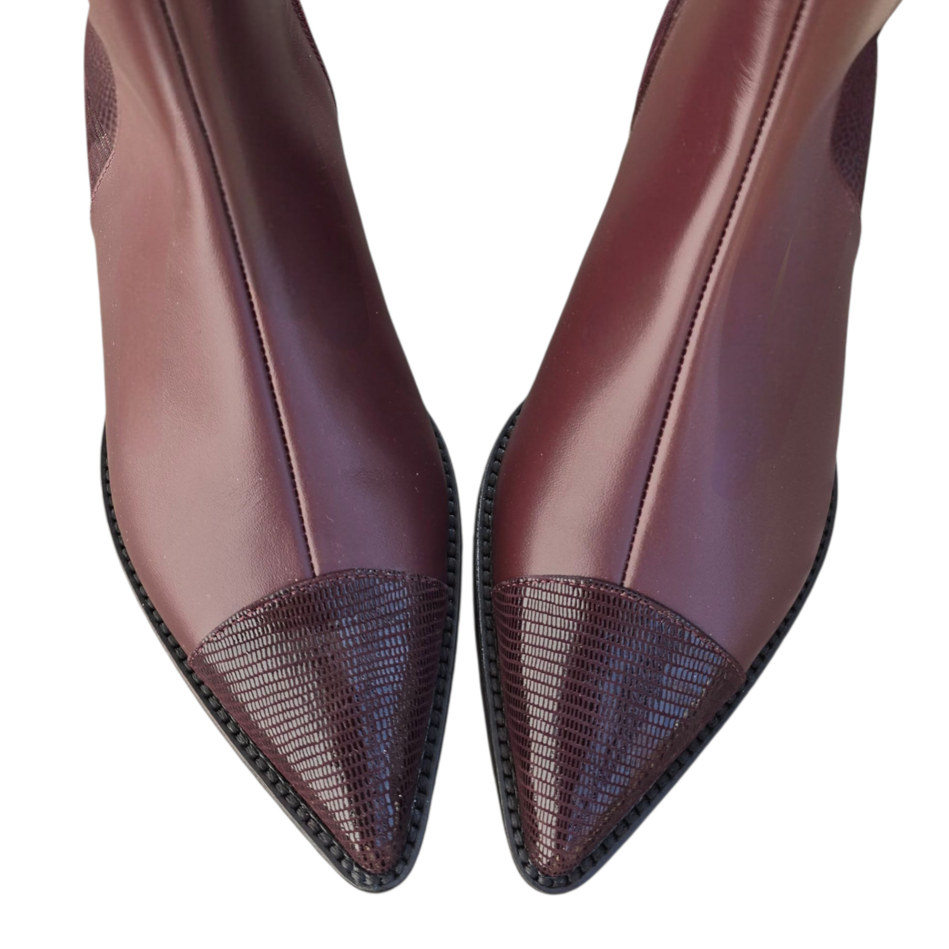Stivaletto flat a punta con suola in gomma in pelle prugna con punta e retro in pelle stampa rettile prugna