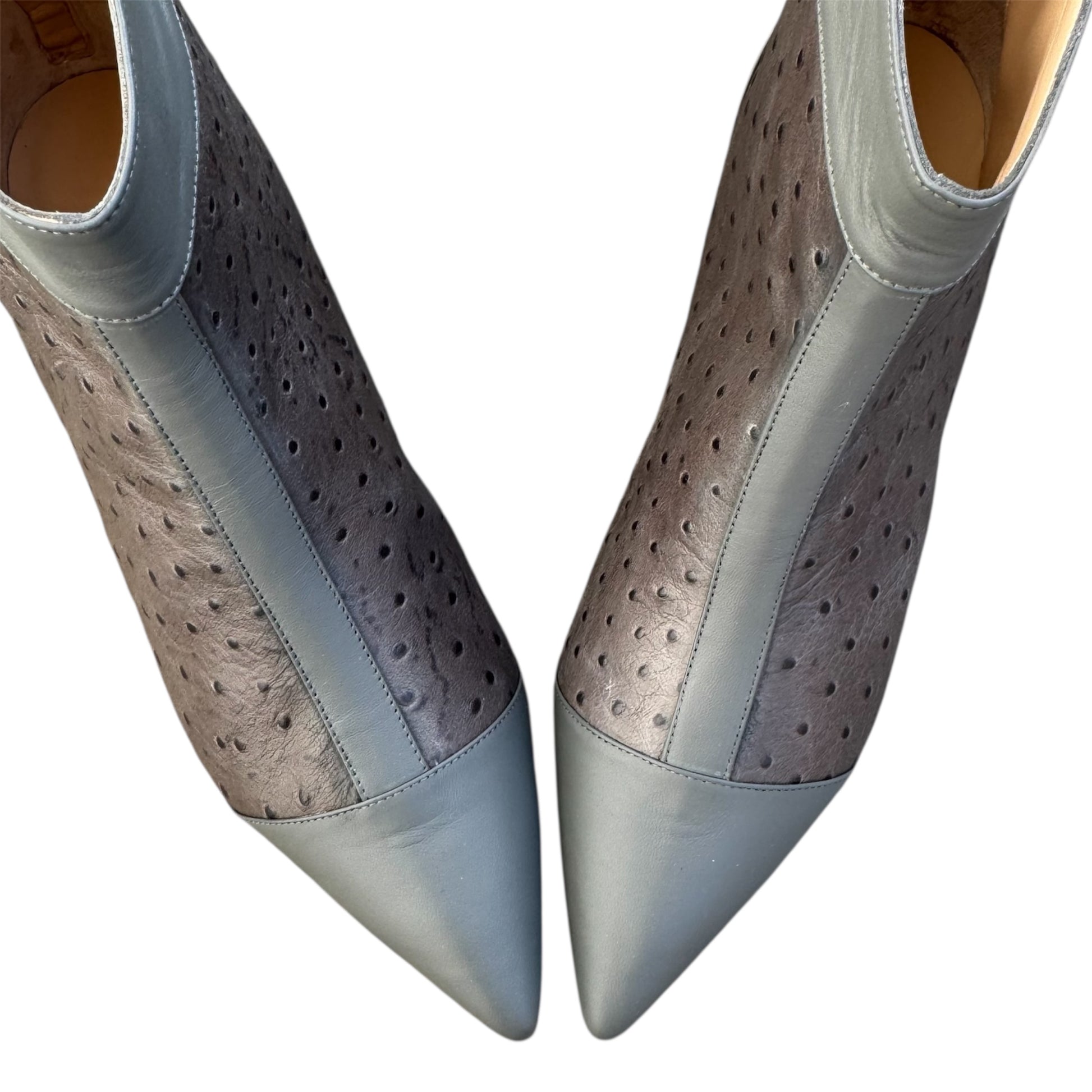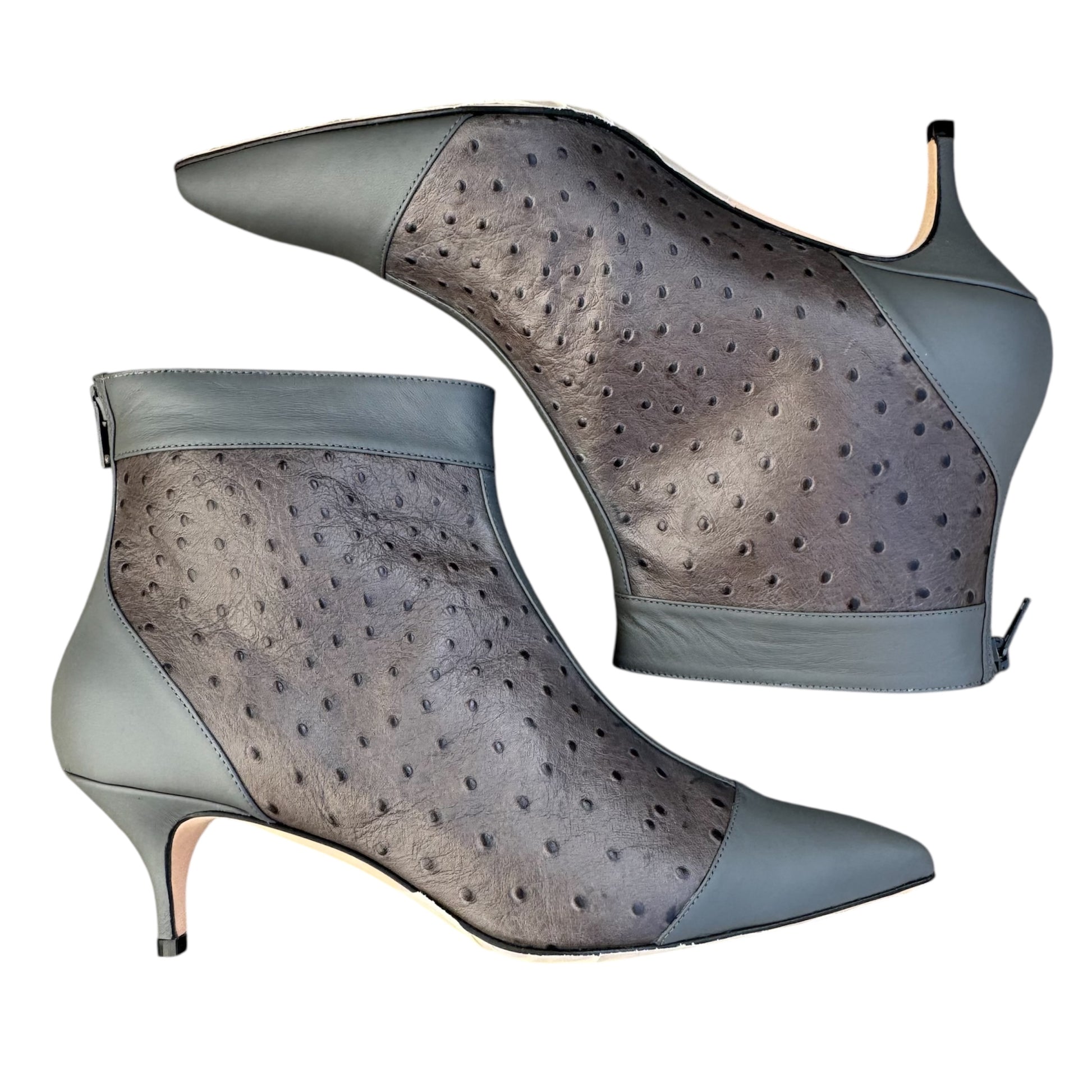 Tronchetto a punta in pelle stampa struzzo grigia e dettagli in pelle liscia