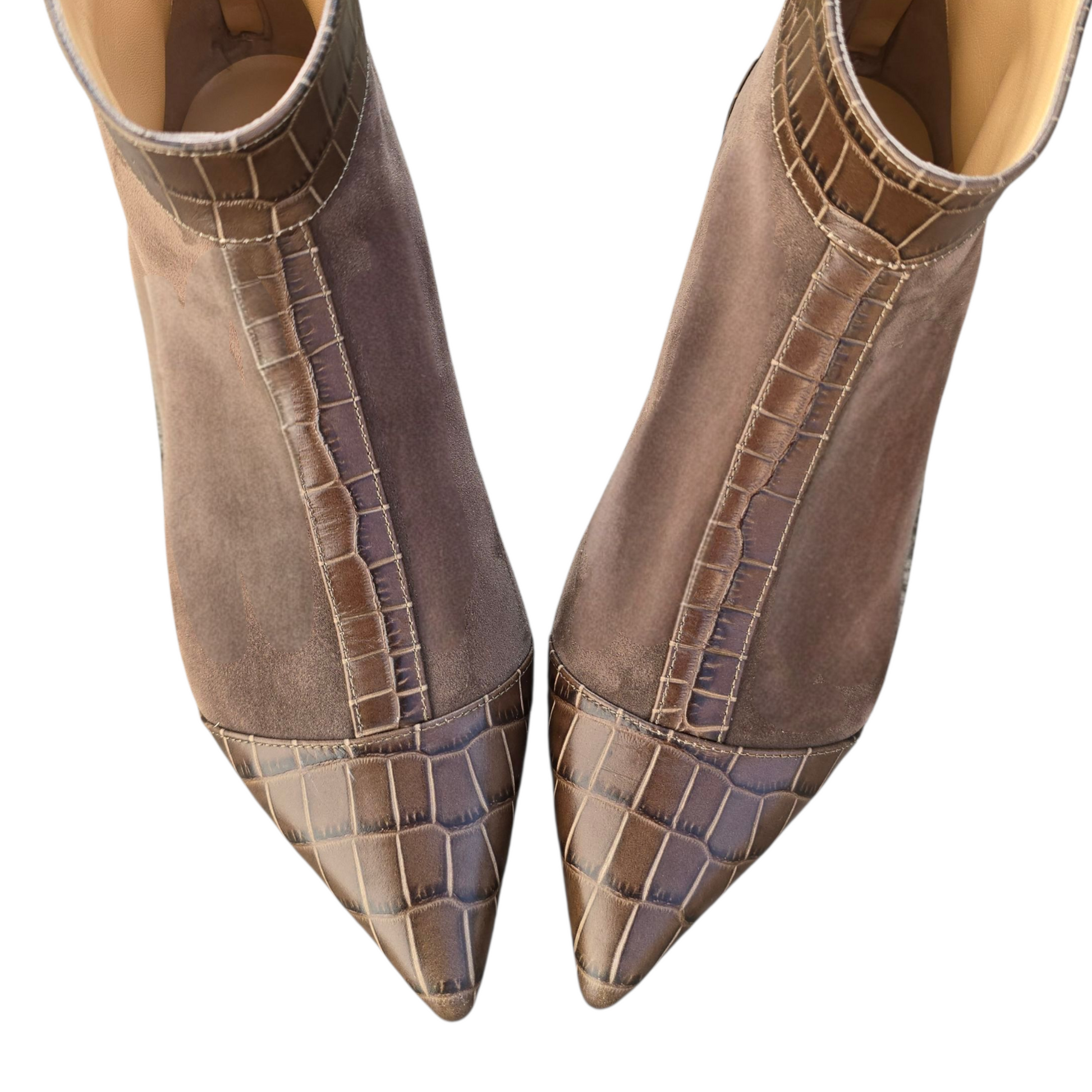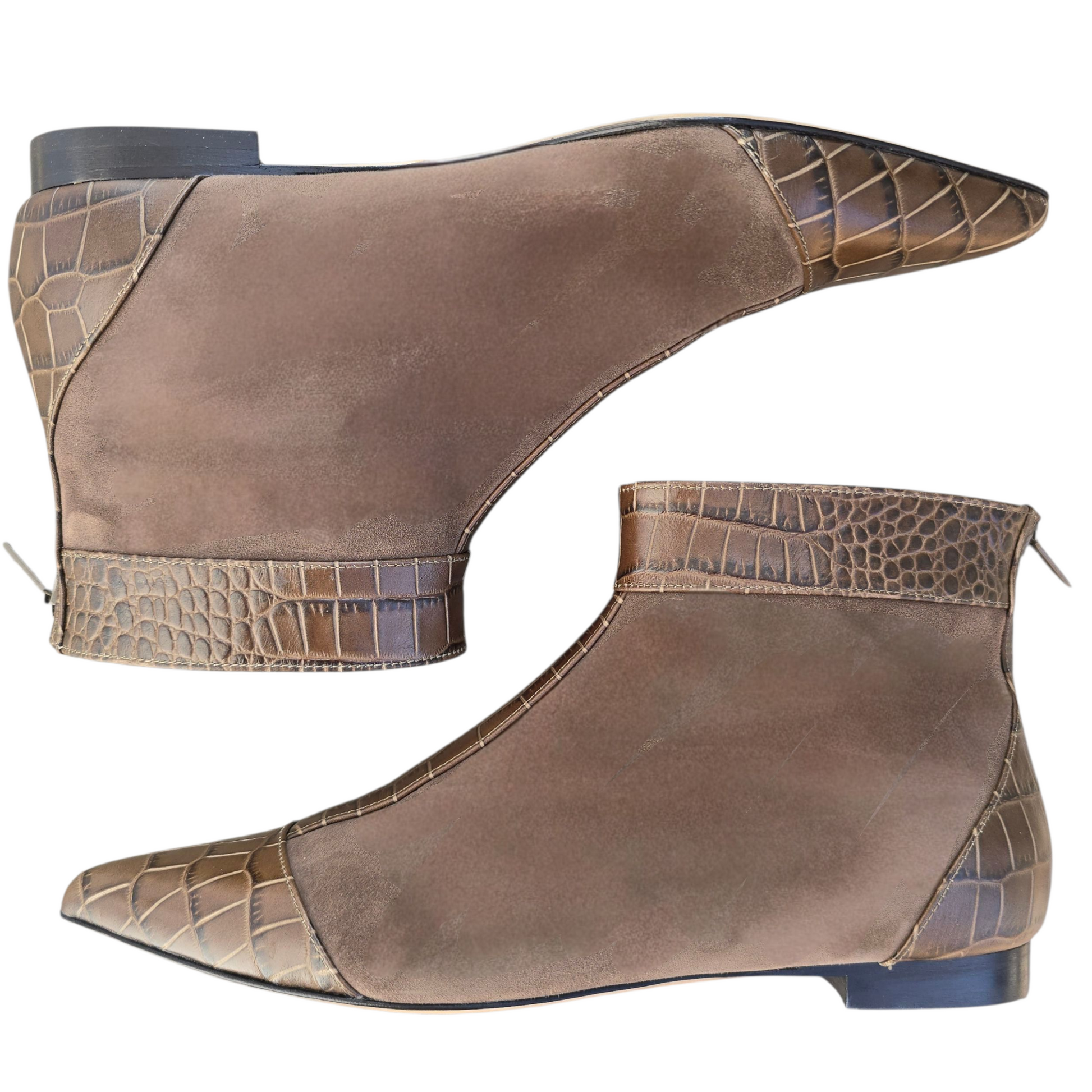 Stivaletto flat a punta in camoscio verde militare con dettagli in pelle stampa cocco verdone