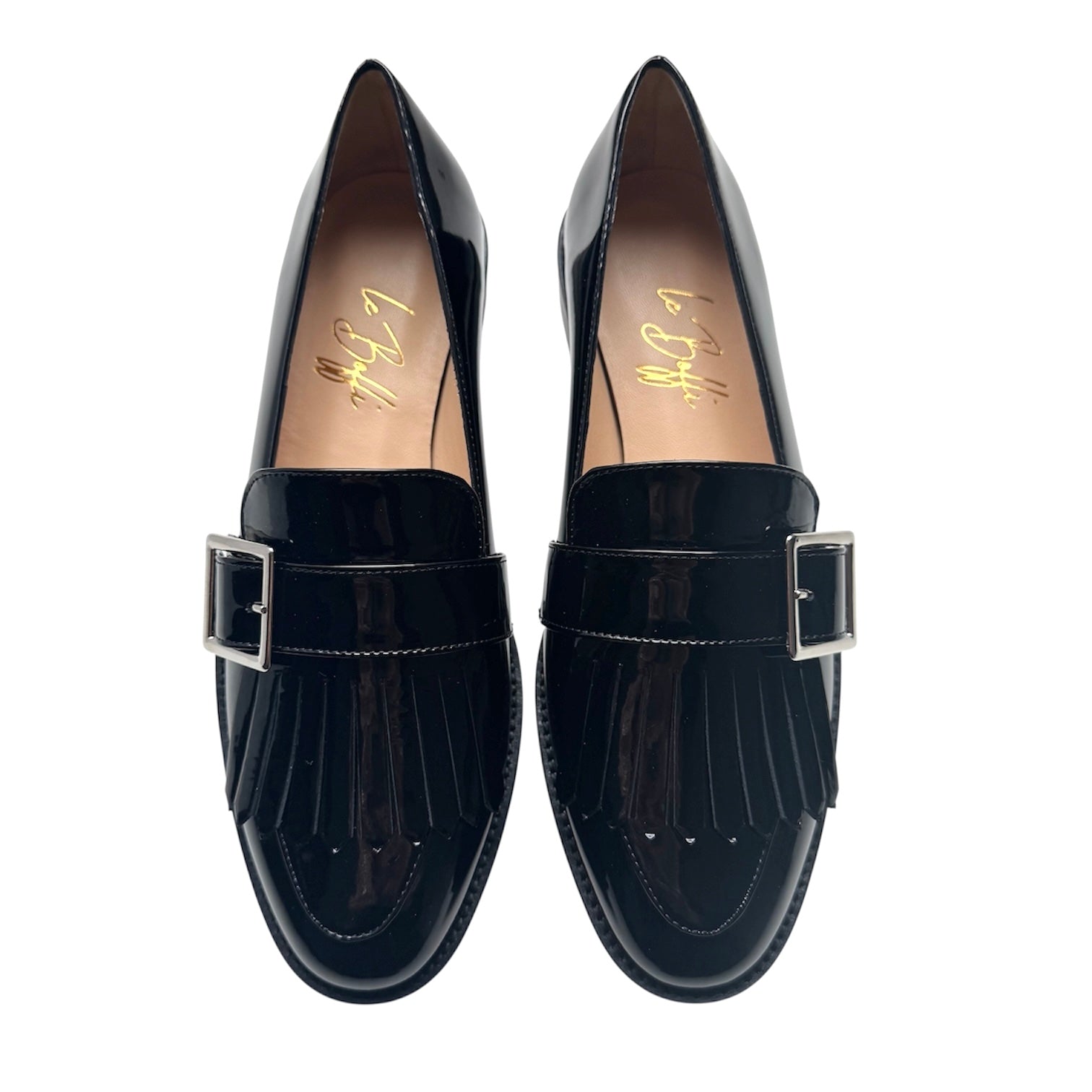Mocassino con suola in gomma in vernice nera e fibbia color argento
