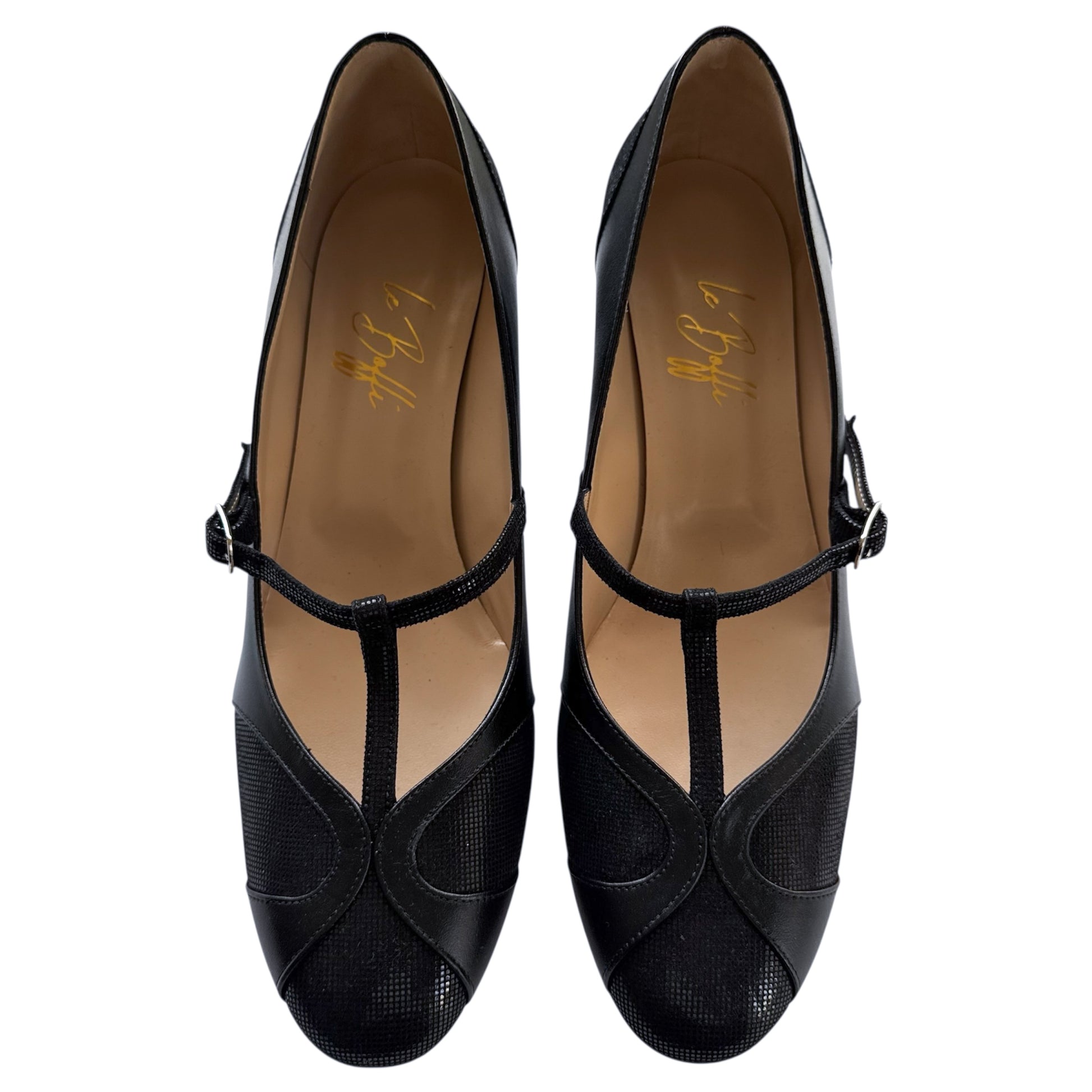 Ballerina a punta tonda con t bar in pelle nera con trama a quadri e pelle nera, tacco 5 cm quadrato