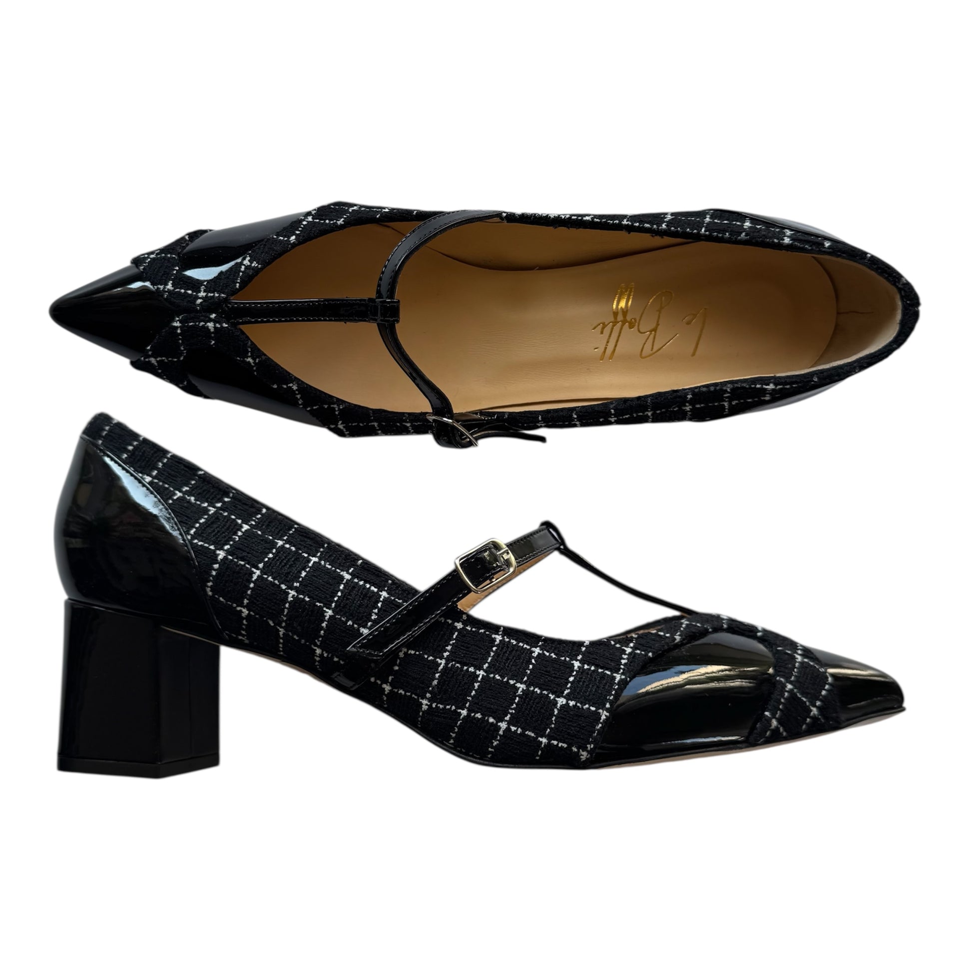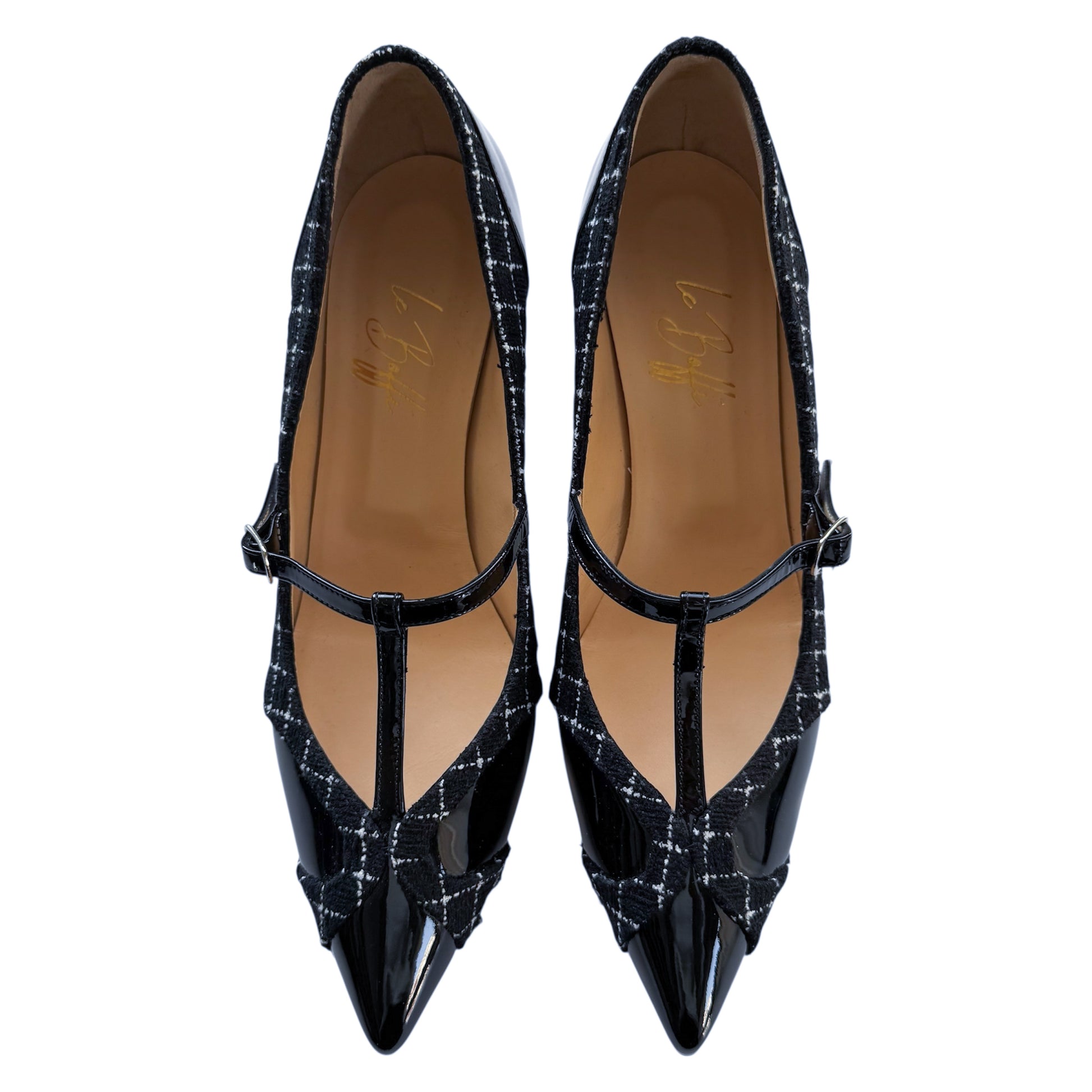 Modello bicolore in bouclé bianco e nero con dettagli in vernice nera, con tacco quadrato
