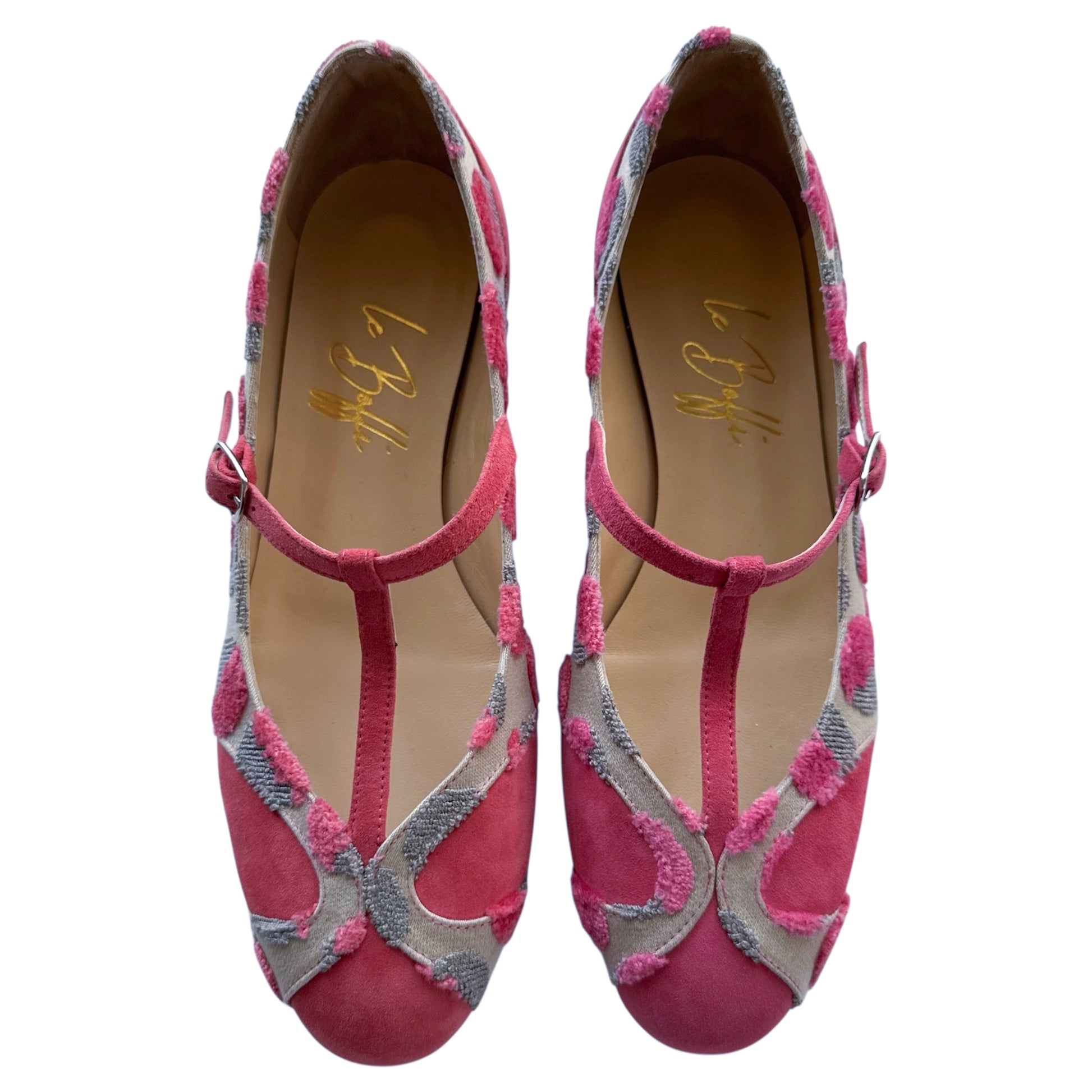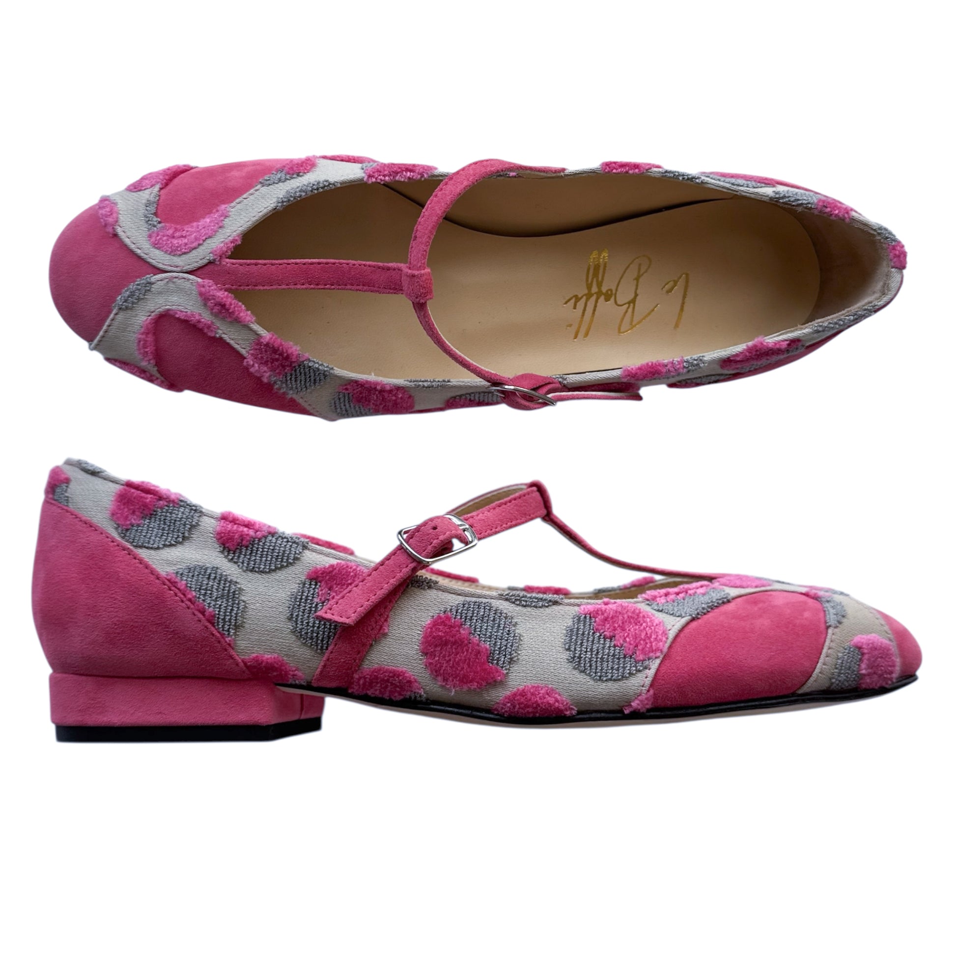 Ballerina a punta tonda in camoscio dalia e tessuto pois