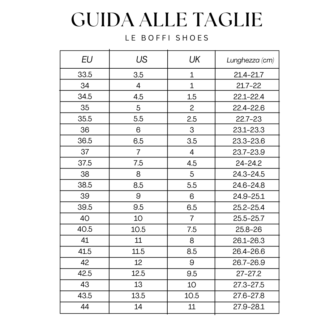 Le taglie della collezione Le Boffi sono modellate sulle misure di seguito indicate. Sappiamo che ogni piede è differente e possono discostarsi da queste misure, ma è comunque possibile utilizzarle come riferimento.
