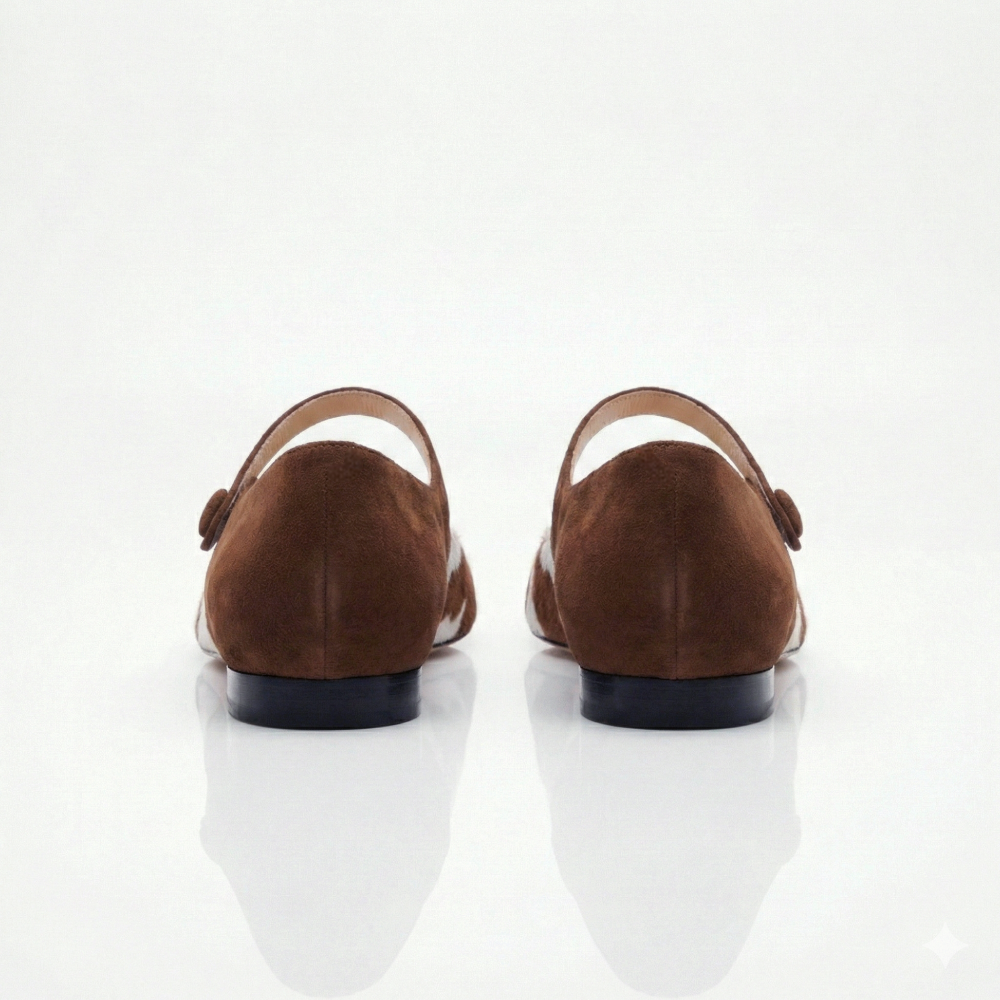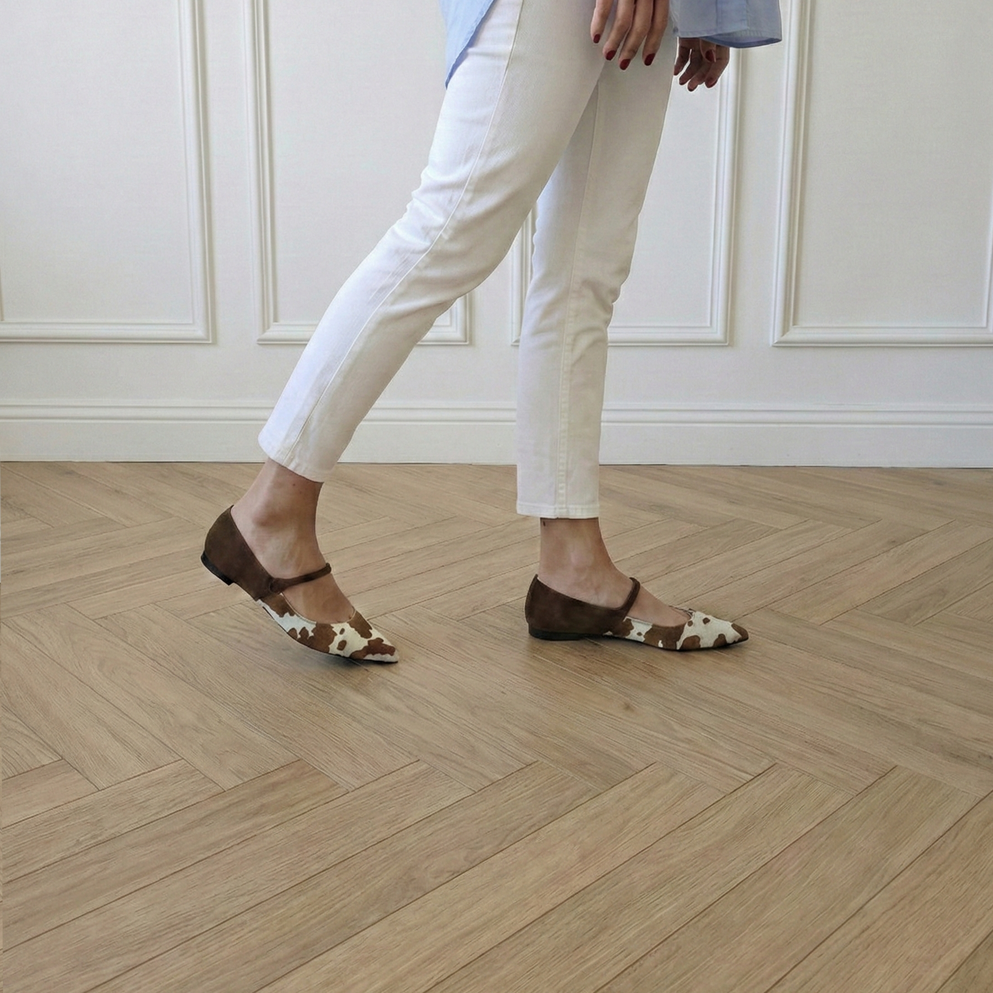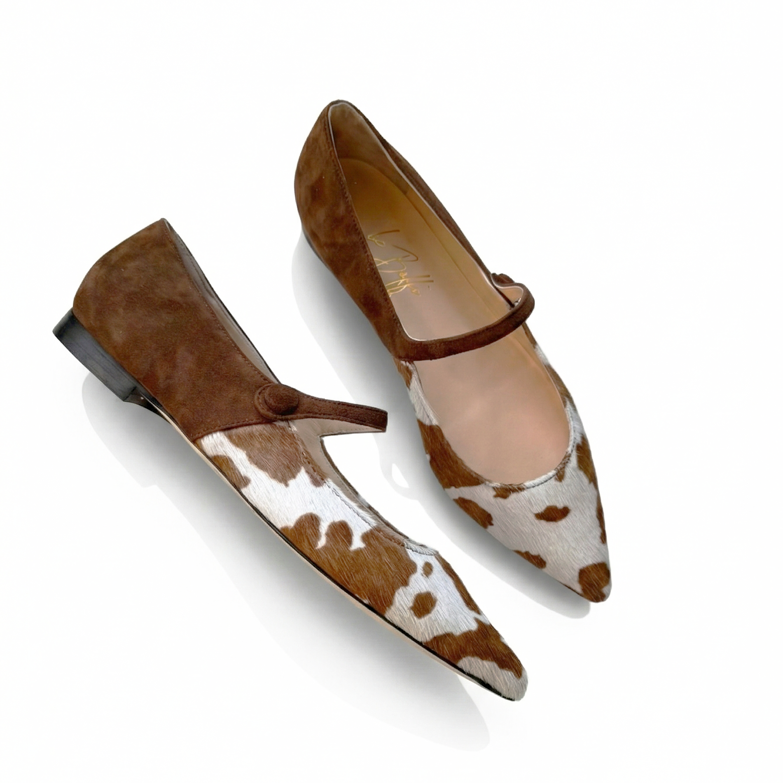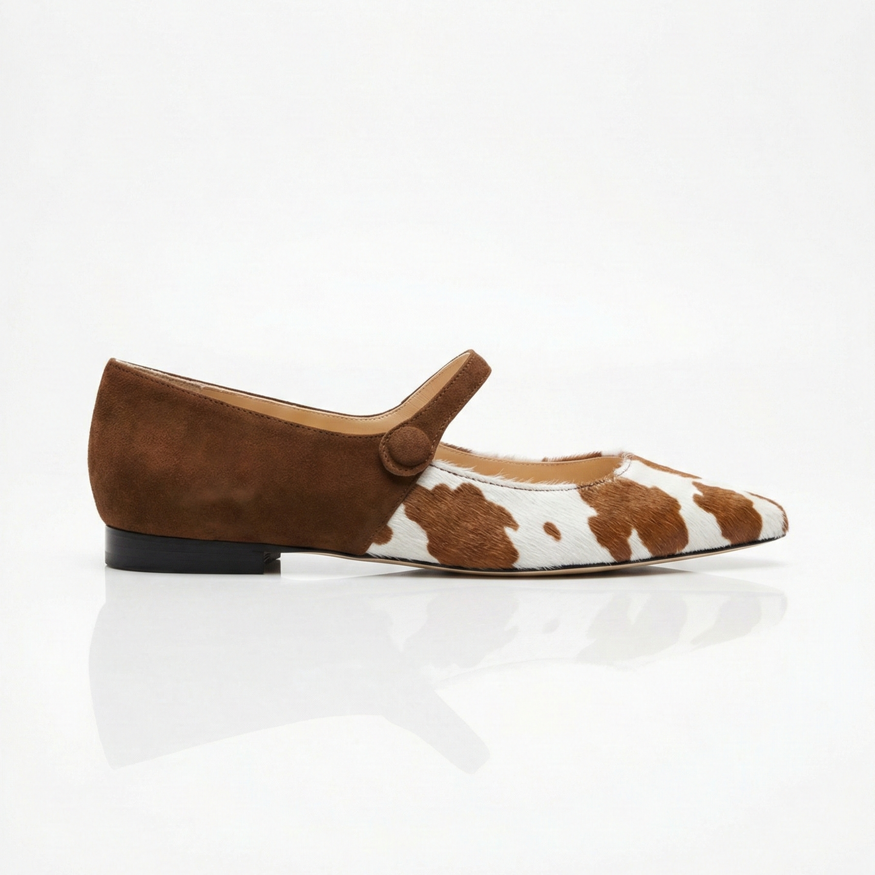 Questa versione bimateriale divide la scarpa in due anime distinte ma armoniose: la punta affusolata in cavallino con stampa muccata dona un tocco grafico e spiritoso, mentre la parte posteriore, il cinturino e il bottone rivestito sono realizzati in morbido camoscio tabacco. Il risultato è un equilibrio perfetto tra stile contemporaneo e bon-ton cittadino.