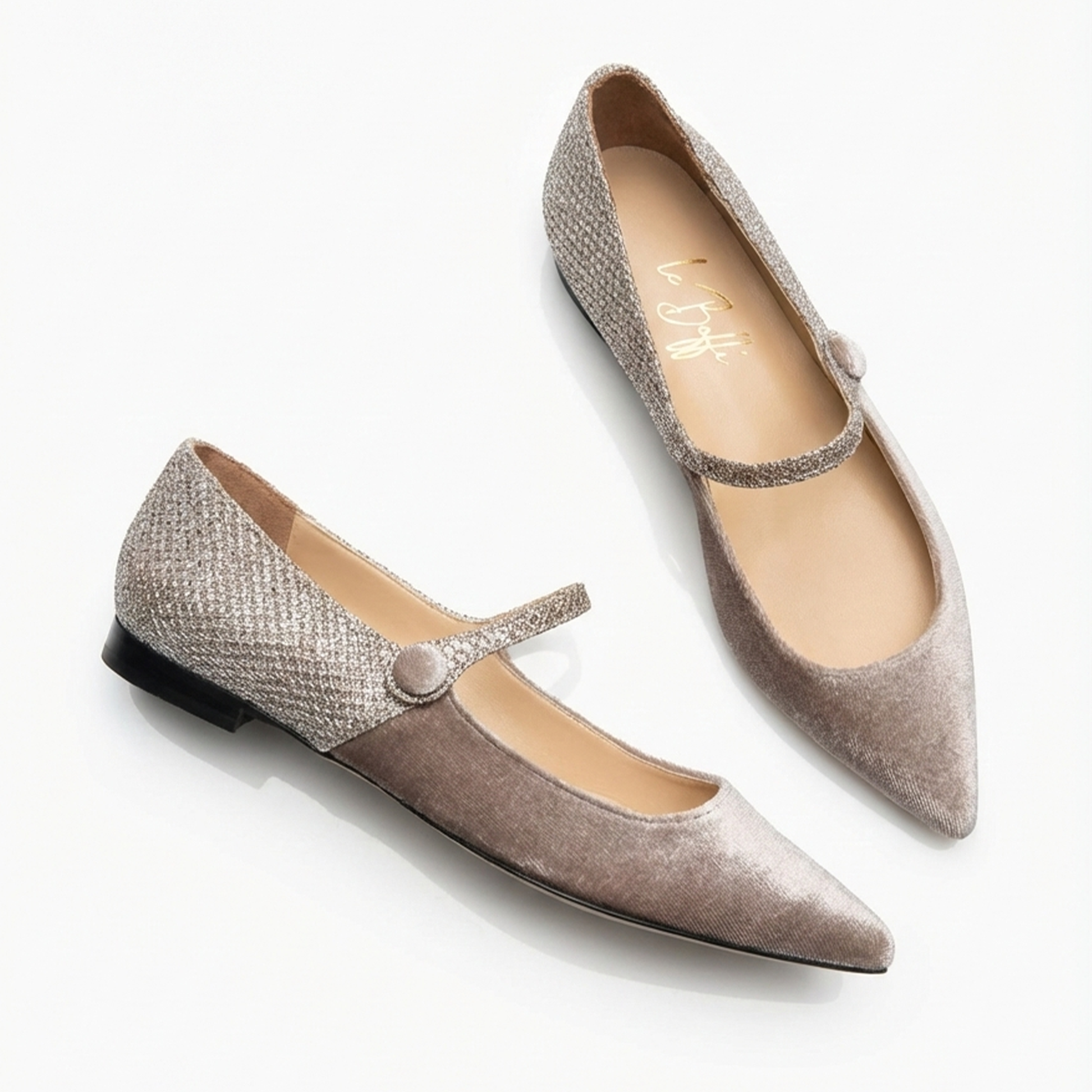 La silhouette a punta è divisa in due texture complementari: la parte anteriore è avvolta in morbido velluto color noce, che dona profondità e un'allure nobile alla calzatura. La parte posteriore e il cinturino, invece, sorprendono con un tessuto lavorato dall'effetto glitter, che cattura la luce ad ogni passo creando un delicato effetto scintillante.