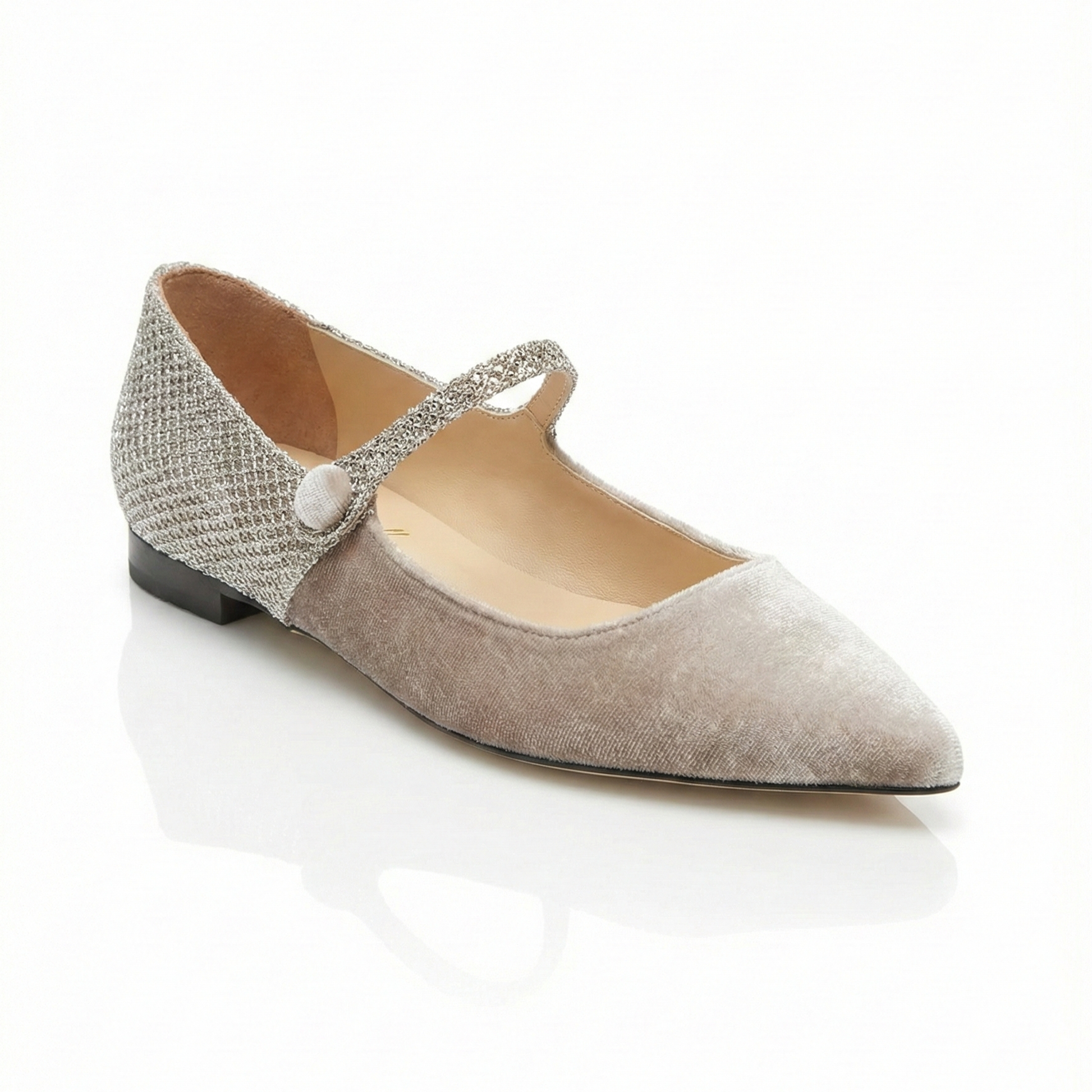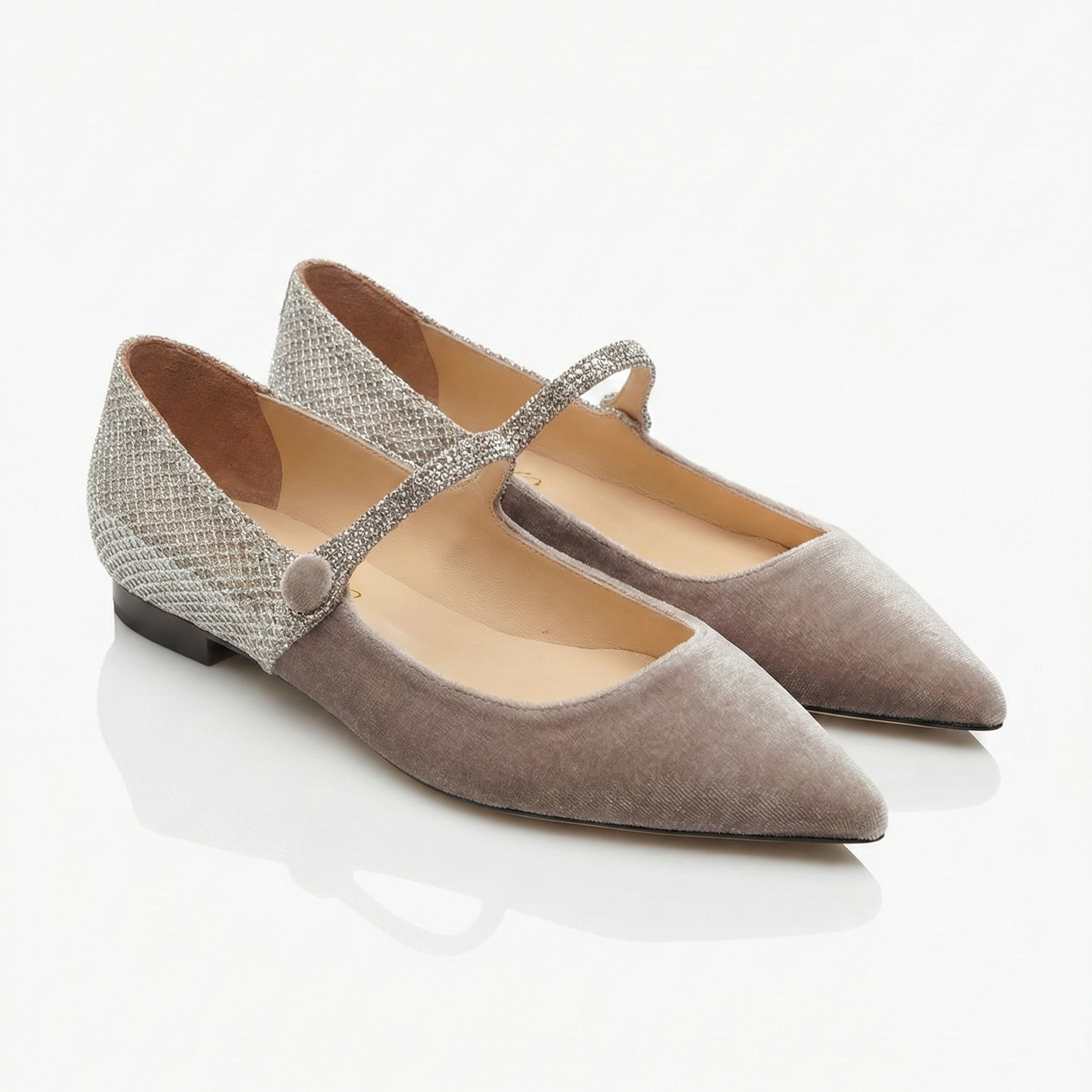 La silhouette a punta è divisa in due texture complementari: la parte anteriore è avvolta in morbido velluto color noce, che dona profondità e un'allure nobile alla calzatura. La parte posteriore e il cinturino, invece, sorprendono con un tessuto lavorato dall'effetto glitter, che cattura la luce ad ogni passo creando un delicato effetto scintillante.