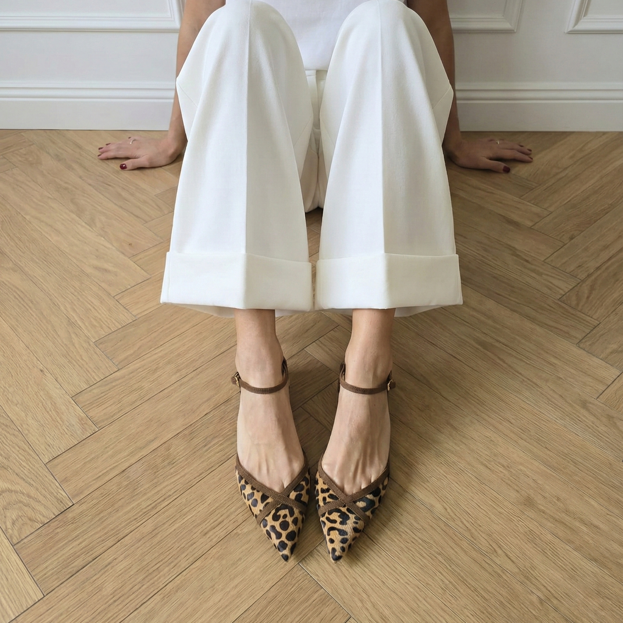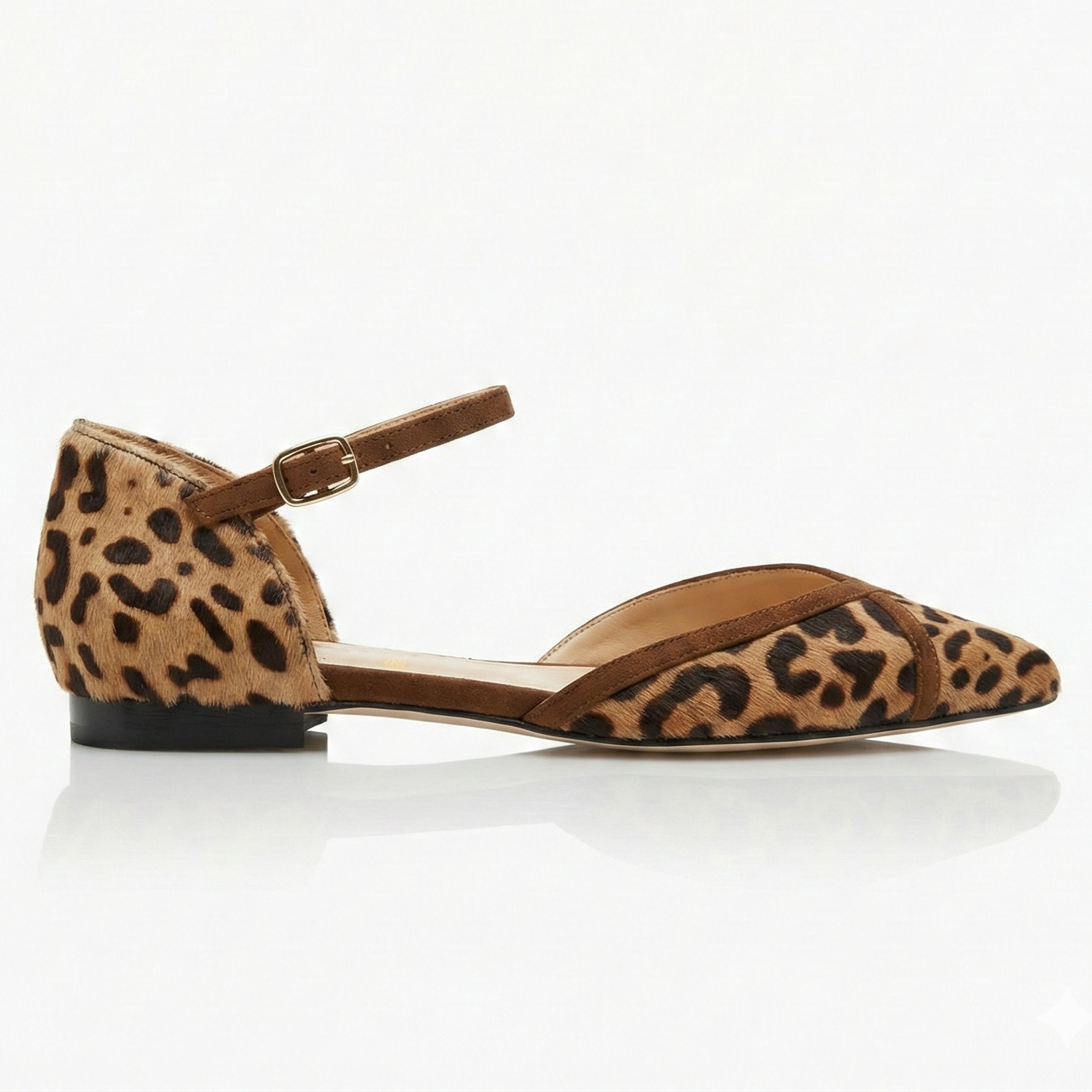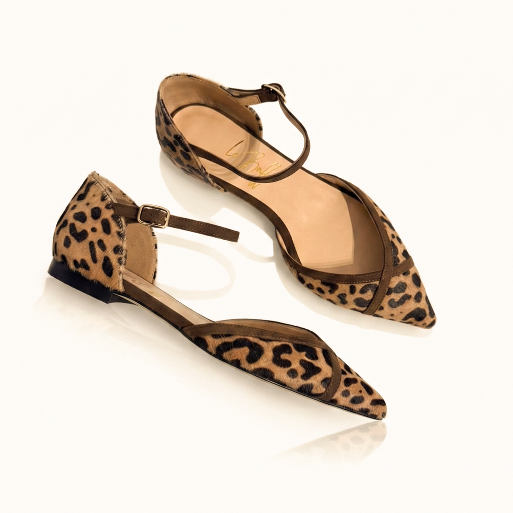 La tomaia in pregiato cavallino stampa leopardo sprigiona grinta e carattere, mentre i profili e i listini in morbido camoscio tabacco aggiungono una nota di calore e morbidezza. Il dettaglio distintivo? I cinturini in suede che si incrociano sulla punta affusolata, creando un disegno geometrico che slancia la figura con discrezione.