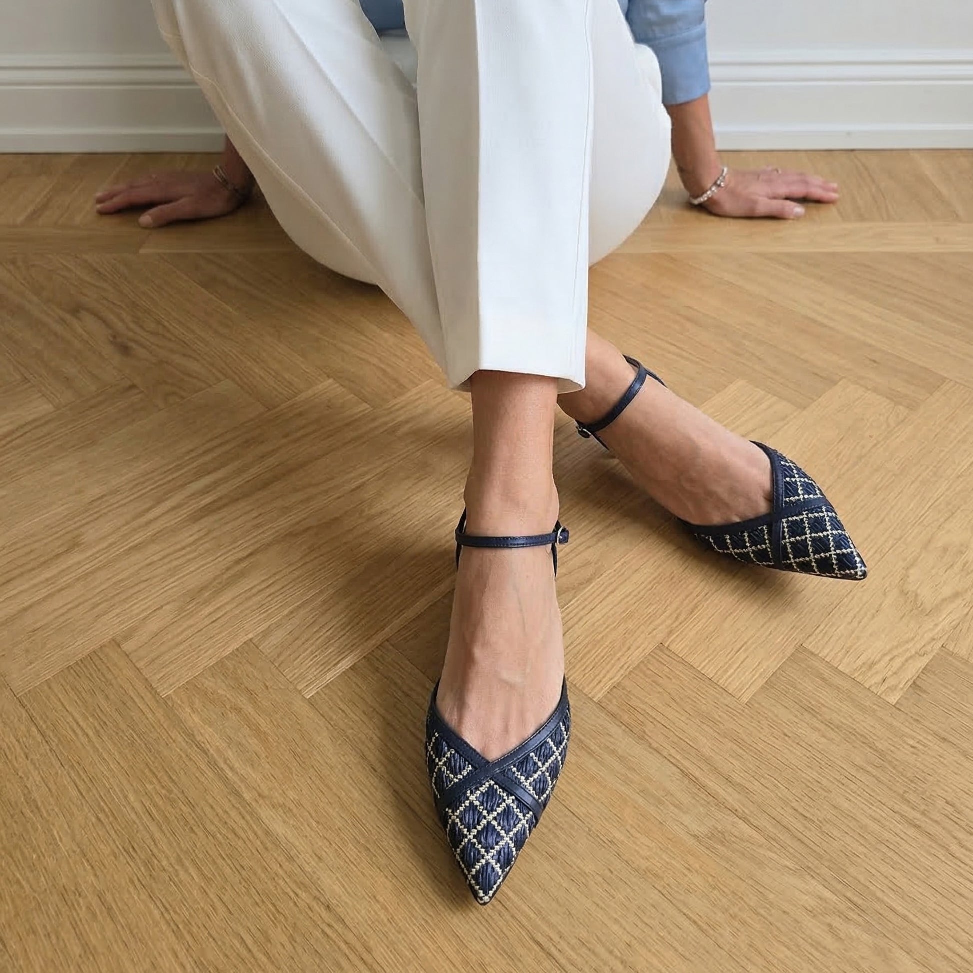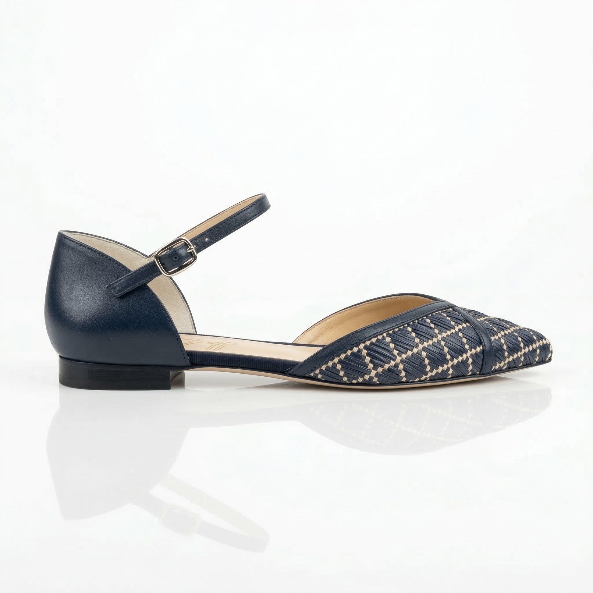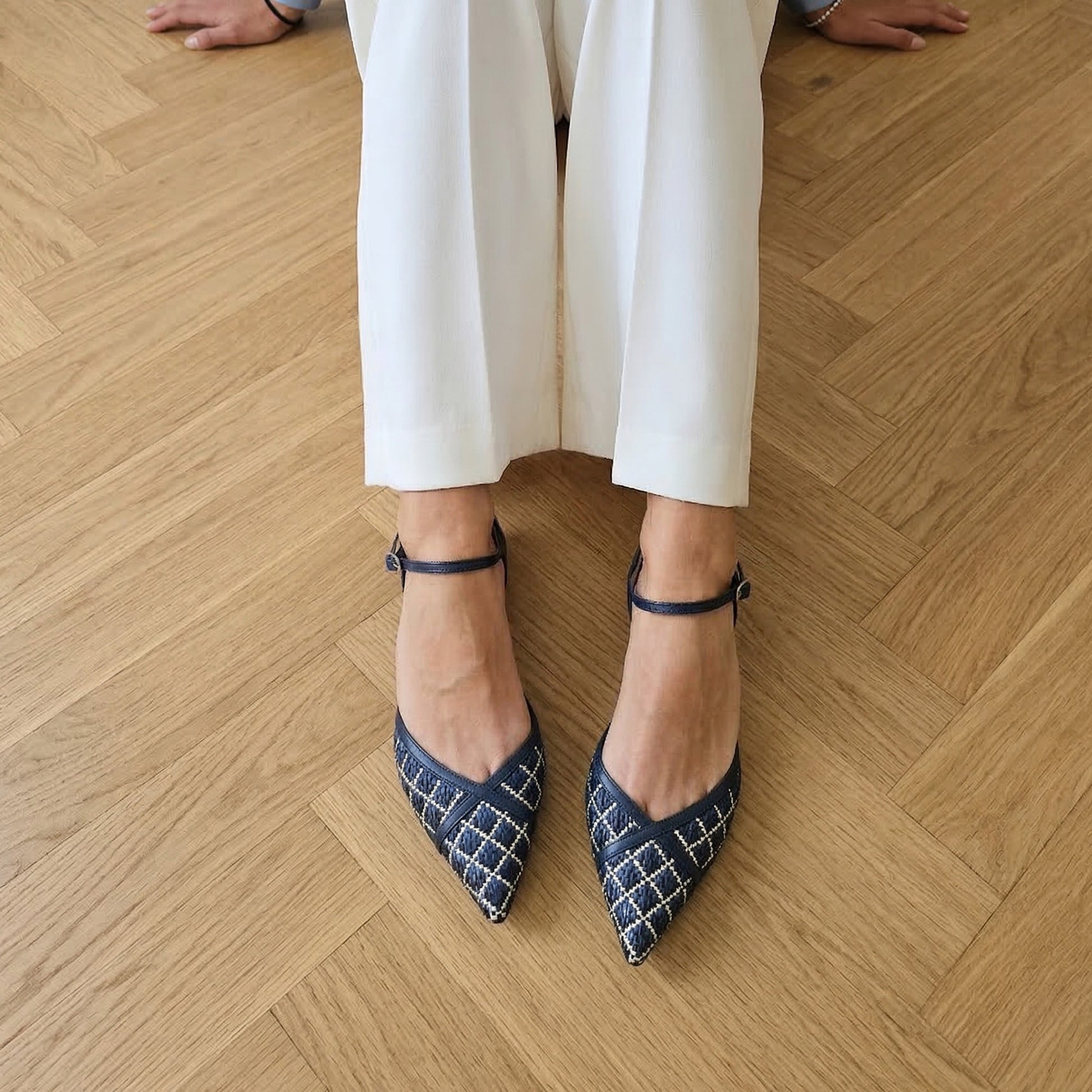 La punta affusolata è realizzata in rafia blu intrecciata con motivi geometrici color bianco panna, che donano alla scarpa un aspetto tridimensionale e arioso. Il tallone e i listini sono invece in pelle blu notte, che incornicia il piede con decisione e assicura una struttura impeccabile. Il risultato è un equilibrio perfetto tra matericità organica e rigore sartoriale.