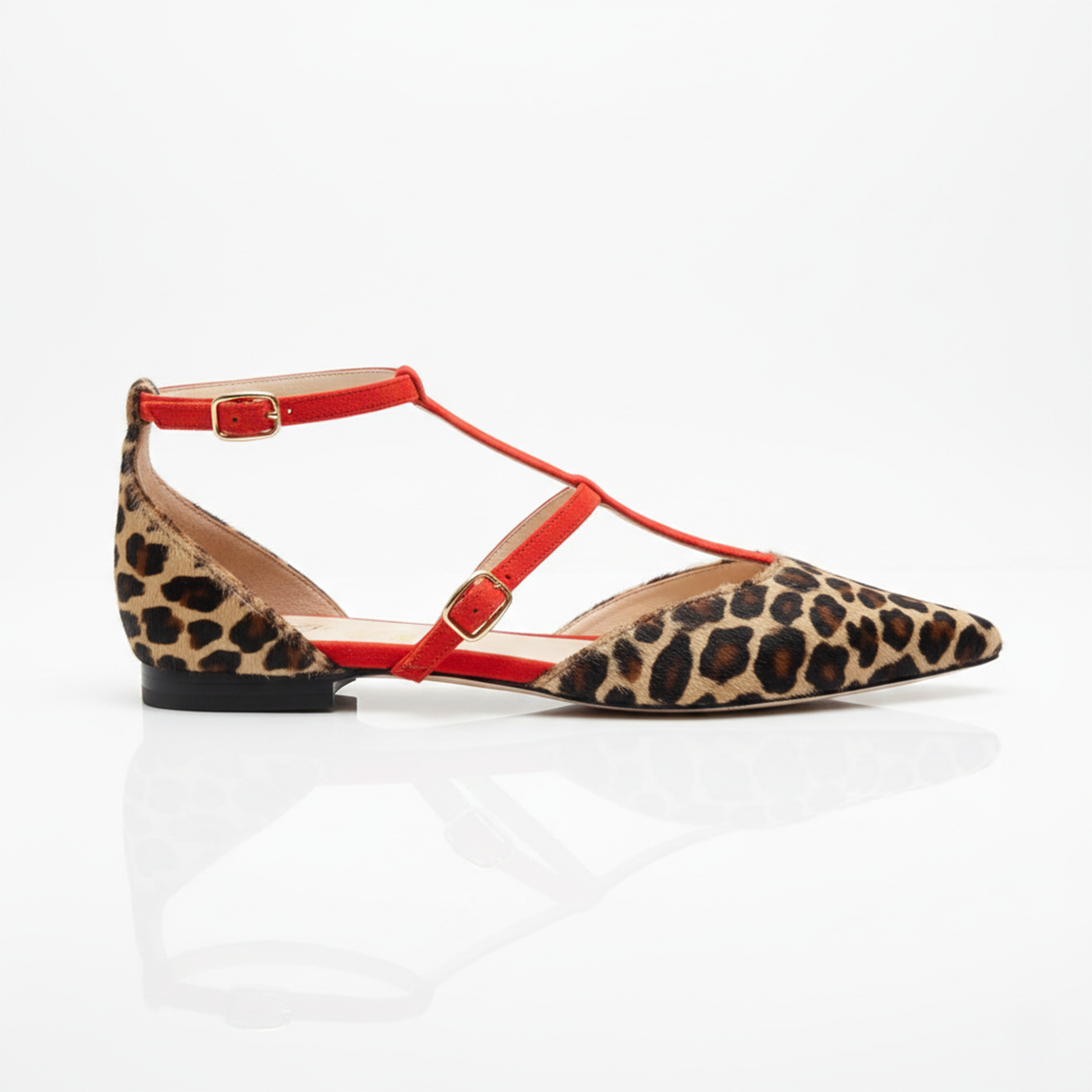 La punta e il tallone sono realizzati in cavallino con stampa lince, mentre i cinturini e i profili sono declinati in un morbido camoscio rosso corallo. Questa struttura non solo decora il piede con una geometria sofisticata, ma offre una calzata sicura e avvolgente grazie alla doppia fibbia regolabile.