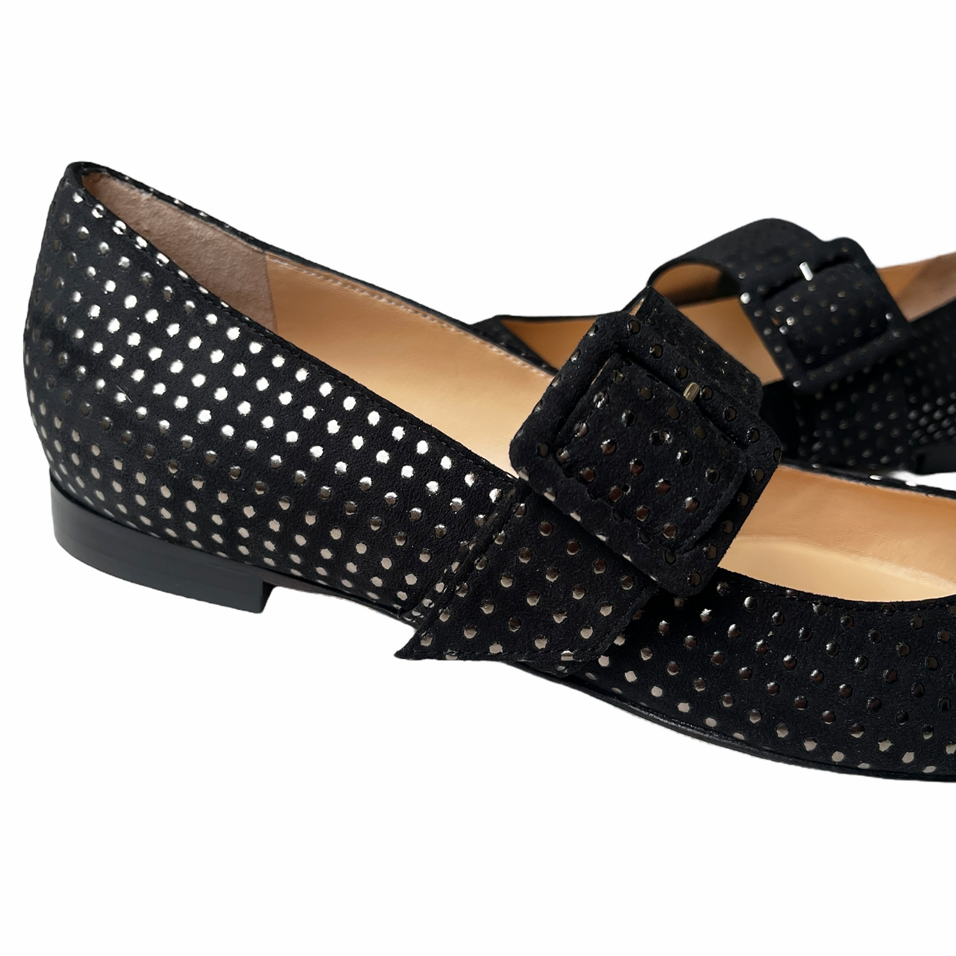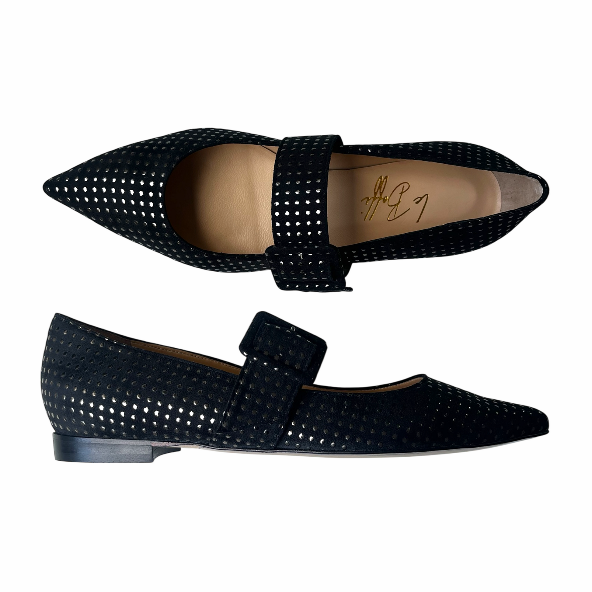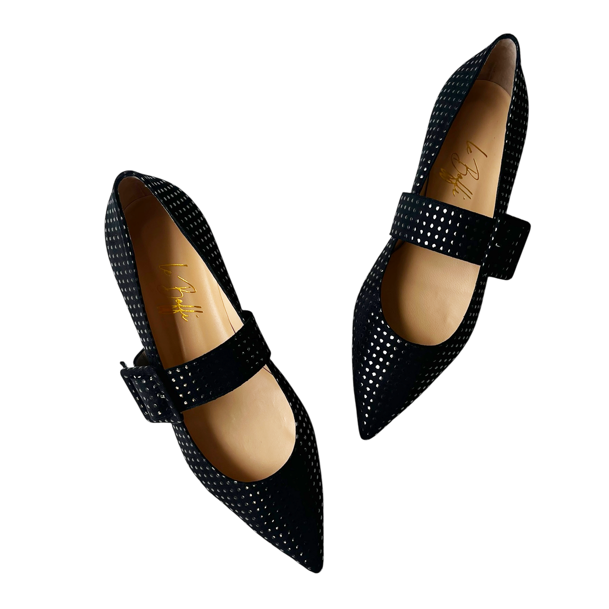 Realizzata in tessuto impreziosito da piccole borchiette, la ballerina Ginevra si distingue per la sua personalità contemporanea. La fascia centrale sul collo del piede, ampia e confortevole, non solo valorizza il design ma assicura anche una calzata stabile e piacevole per tutta la giornata.