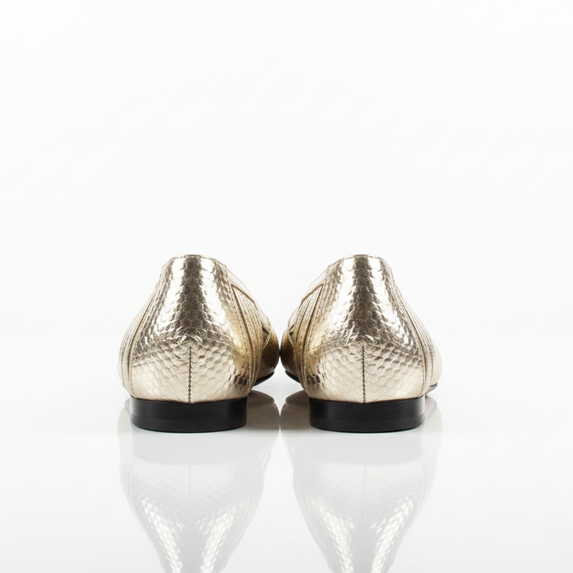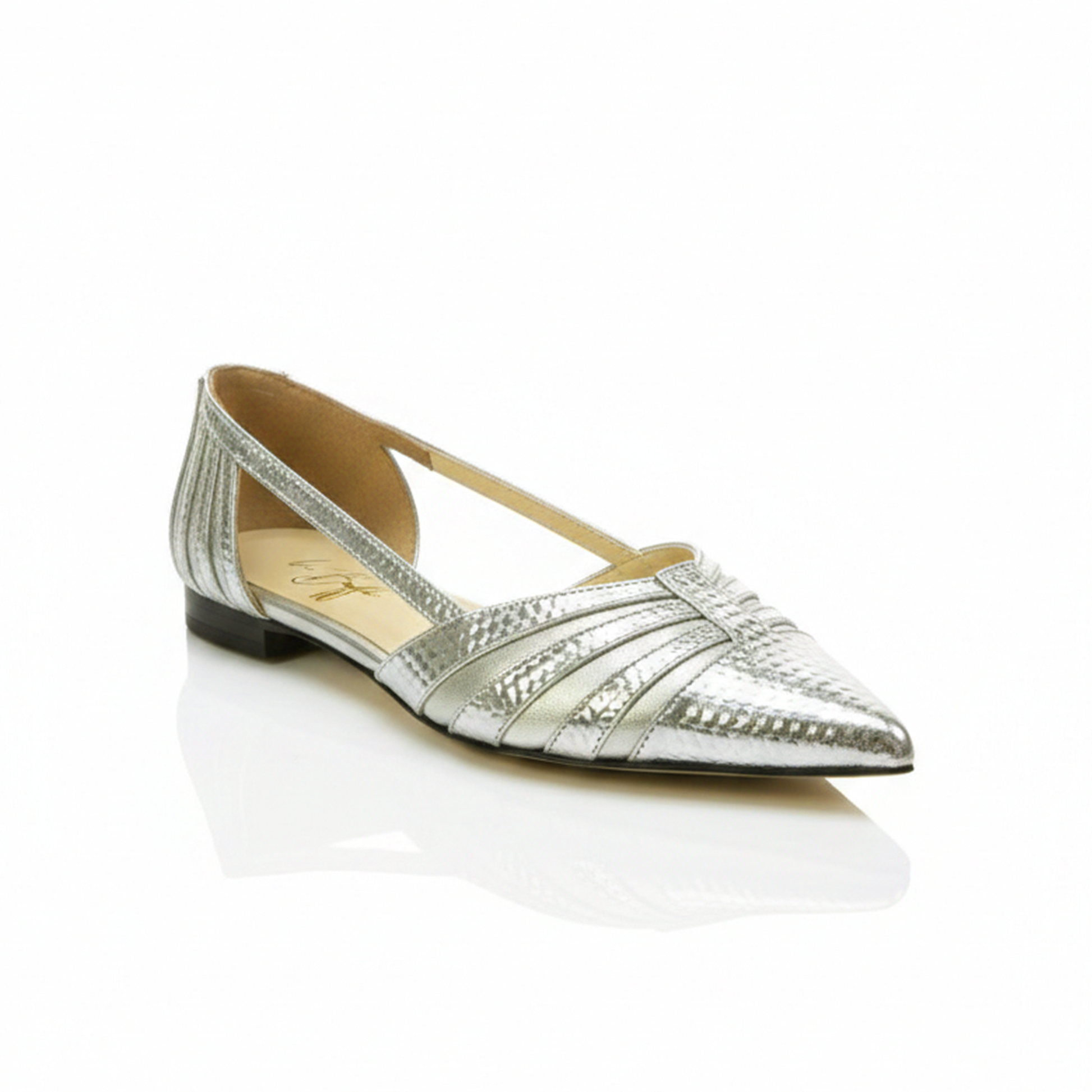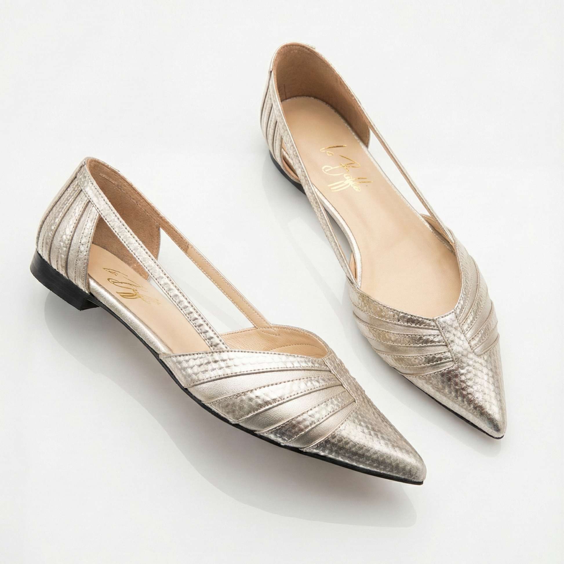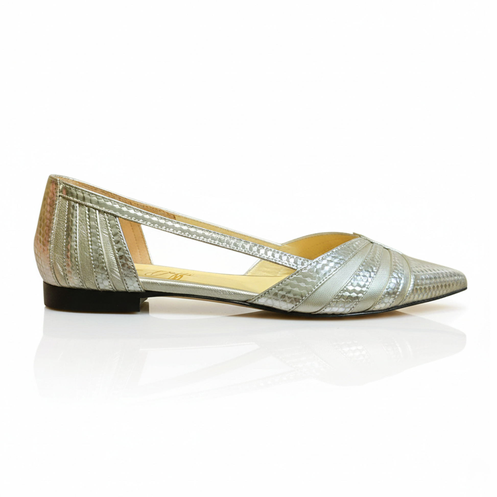 La tomaia è realizzata in un materiale laminato platino, caratterizzato da una sofisticata lavorazione laserata che crea un motivo geometrico e tridimensionale, simile a una squama metallica o a un intreccio high-tech. La punta affusolata ed estremamente decisa dona un carattere graffiante, mentre l'apertura laterale d'Orsay svela il piede con una sensualità discreta e raffinata.