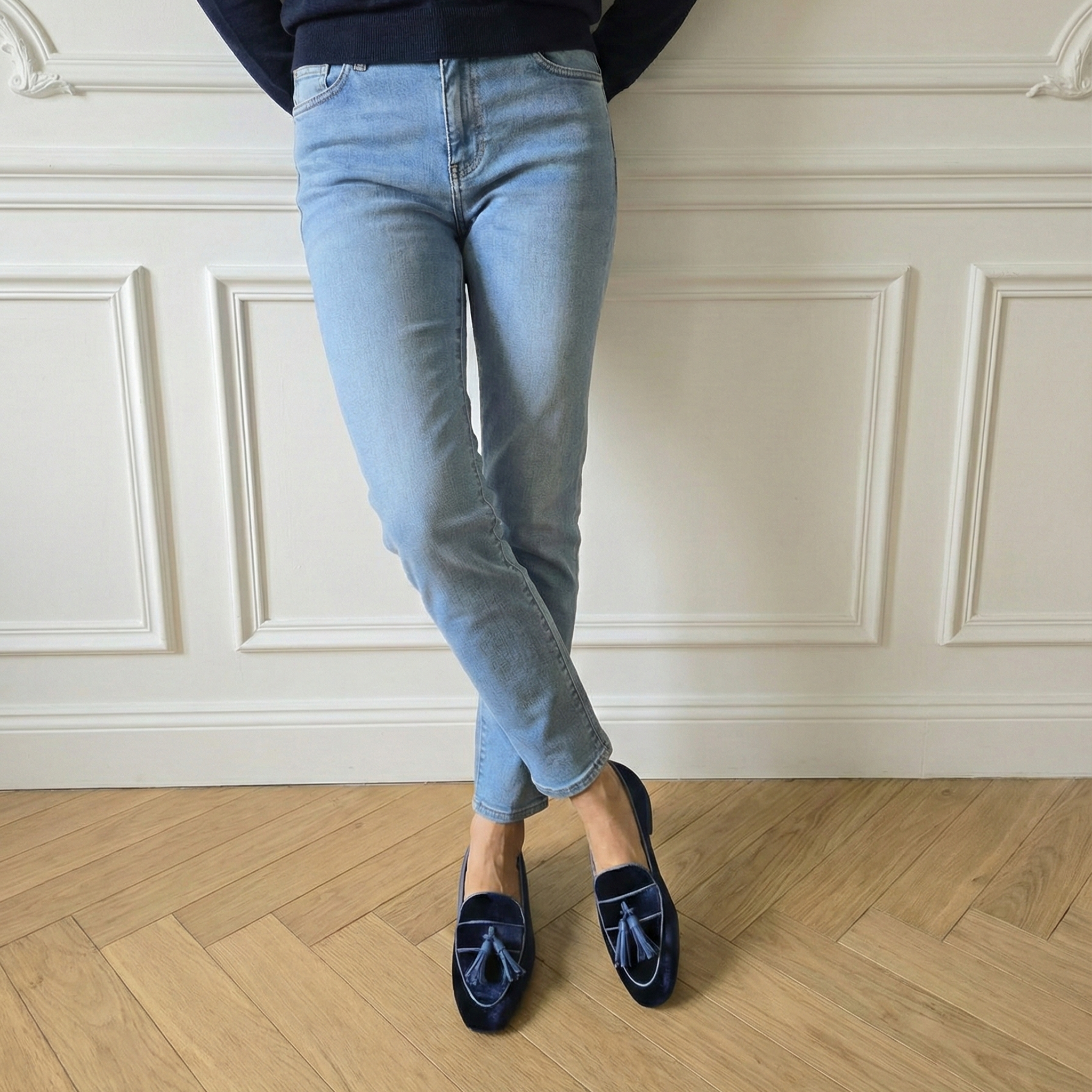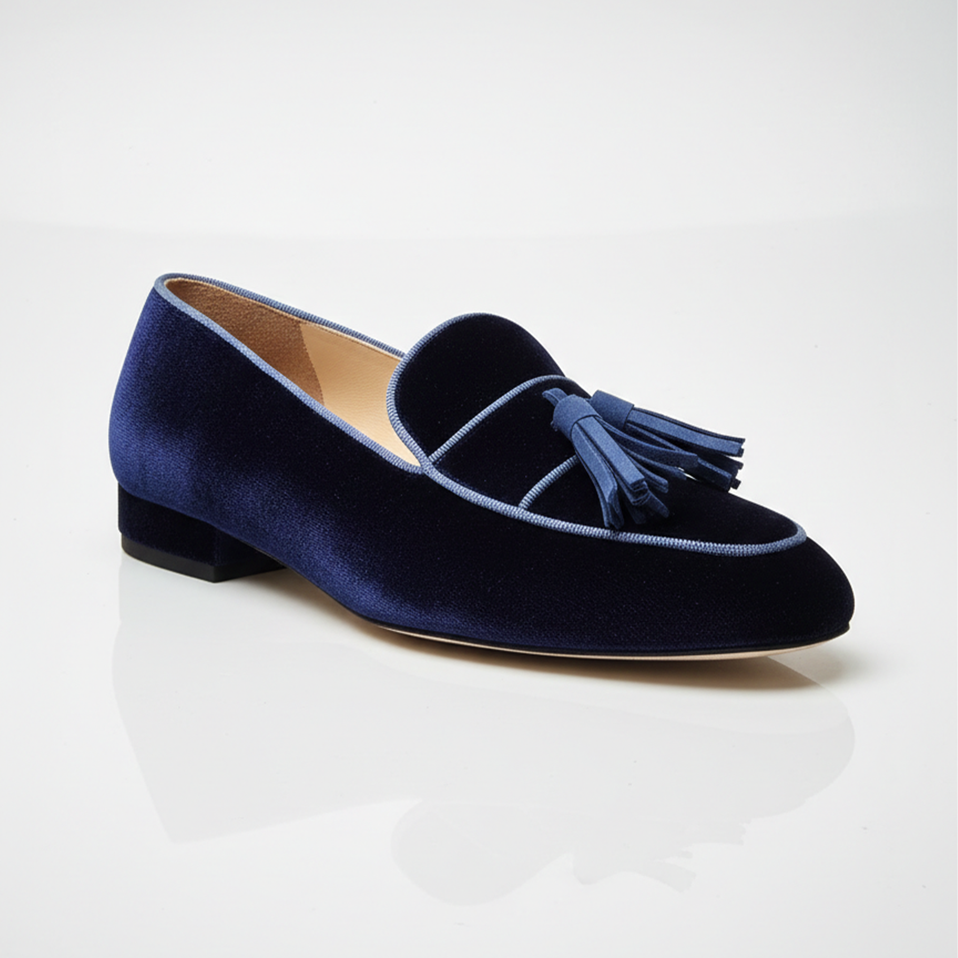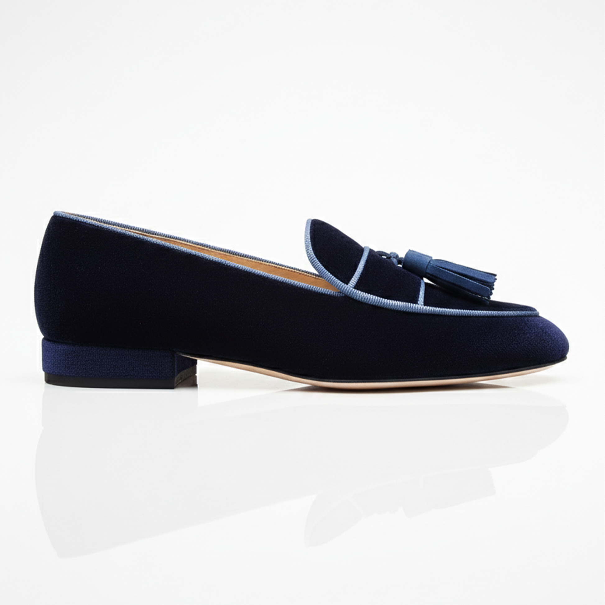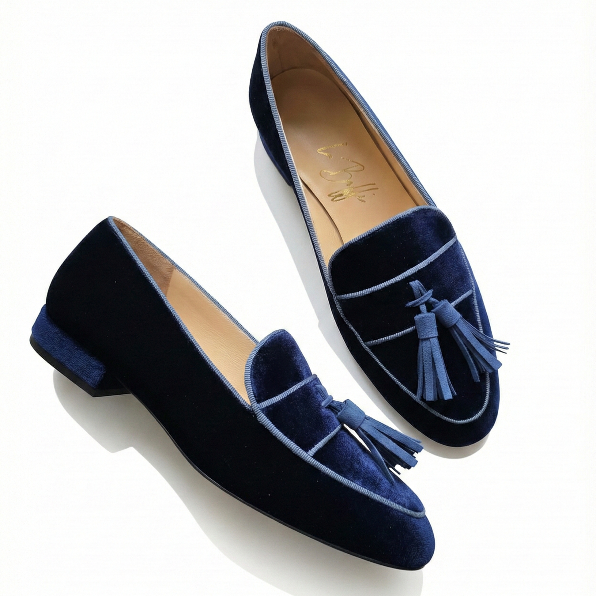 Realizzata in un pregiato velluto blu, Lavinia cattura la luce con riflessi profondi e sofisticati. Il design è impreziosito da un profilo in gros-grain azzurro polvere a contrasto, che delinea la silhouette e culmina in due eleganti nappe (tassels) in camoscio, tono su tono, che aggiungono movimento e un tocco di nobiltà d'altri tempi.
