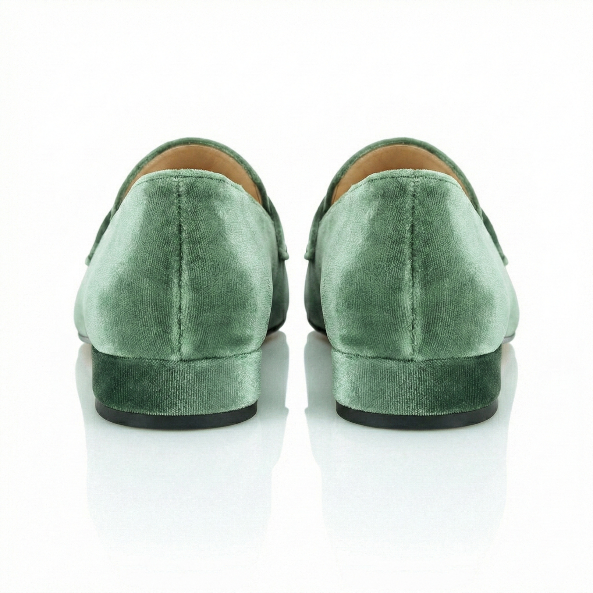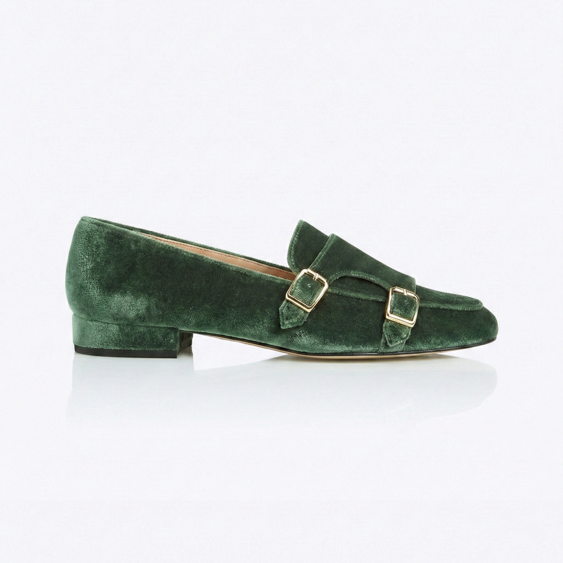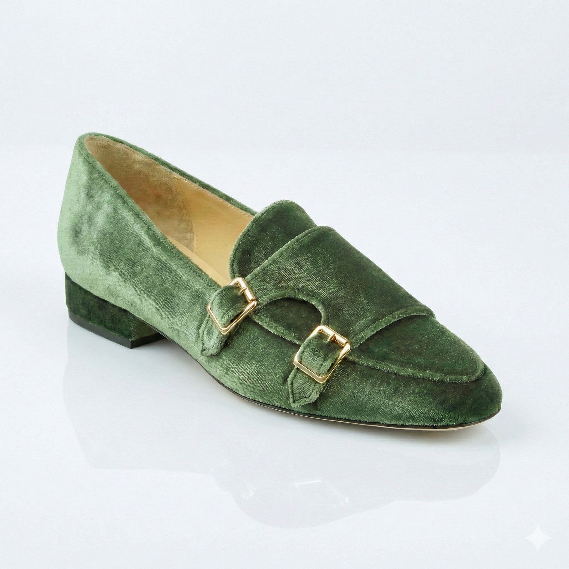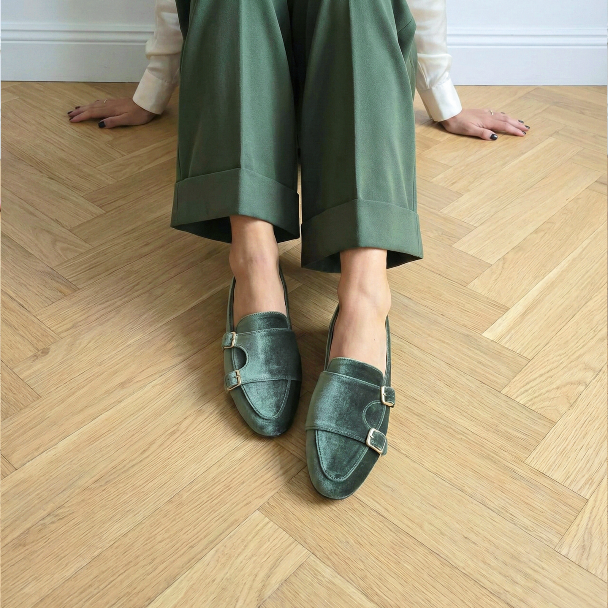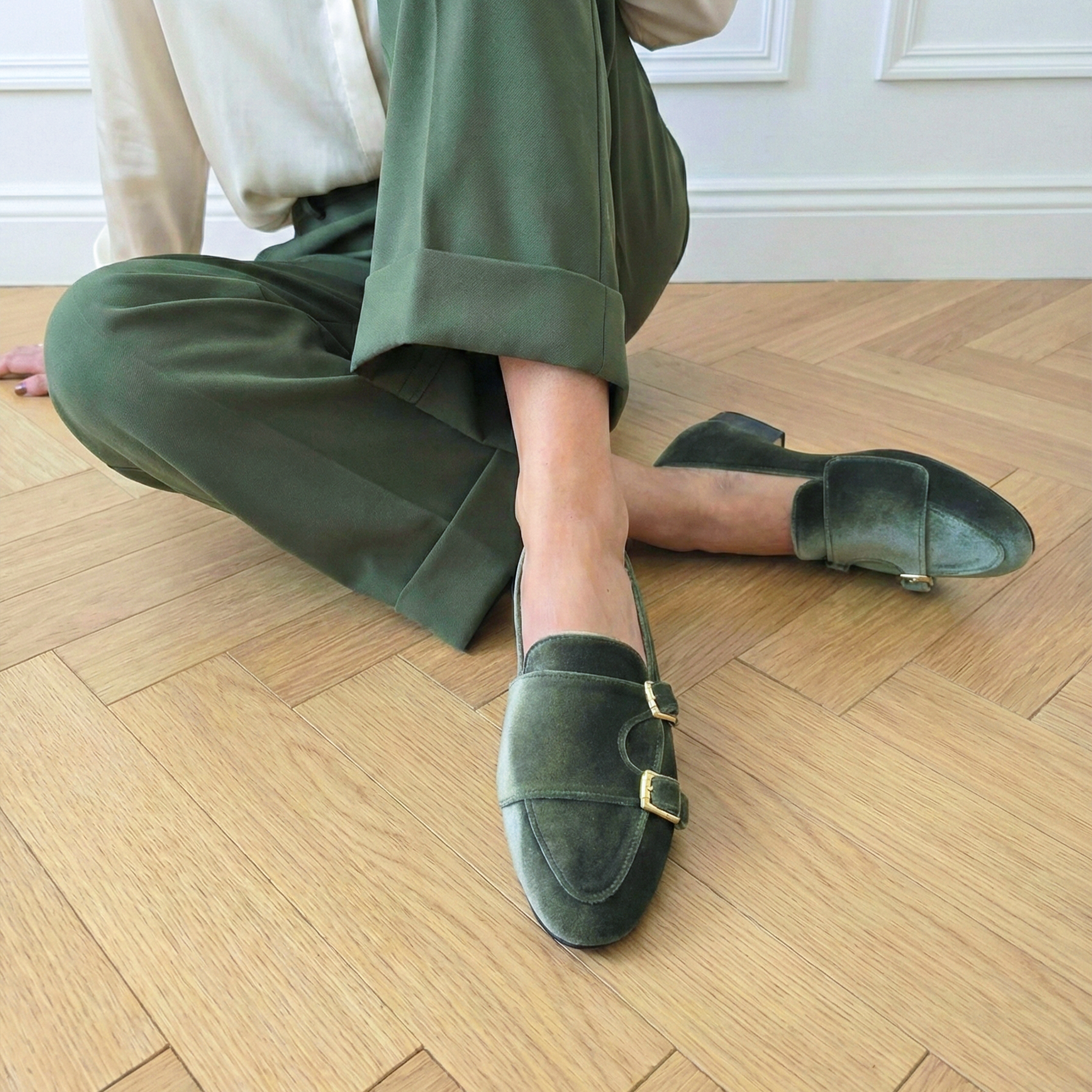 Realizzata in un velluto color Alloro, questa loafer gioca con i chiaroscuri della materia, riflettendo sfumature che oscillano tra il verde salvia profondo e il grigio fumo. Il design è illuminato dalla doppia fibbia oro, un dettaglio metallico che risalta con forza sulla base opaca e serica del velluto, creando un contrasto prezioso.