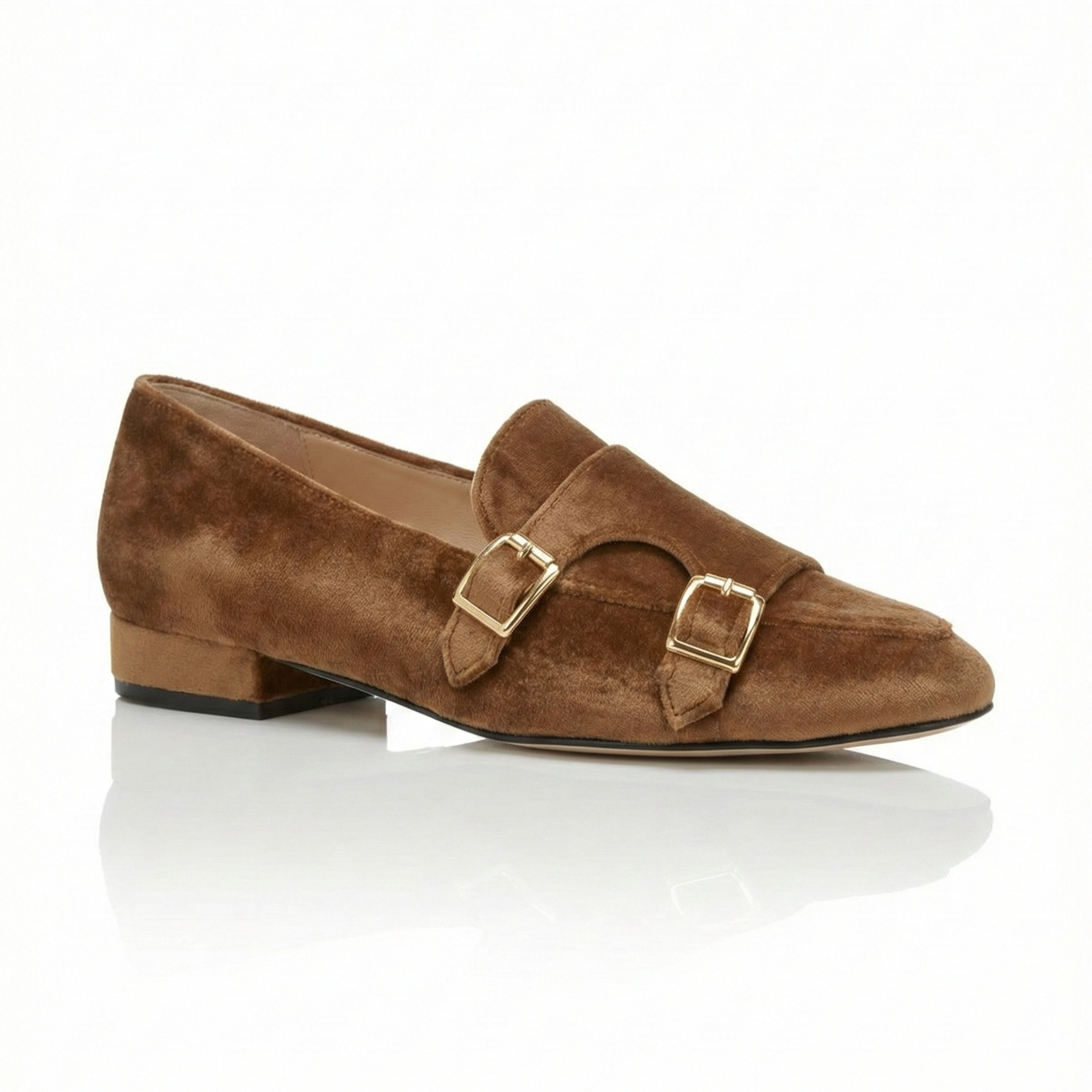 Realizzata in un velluto di seta color cammello, questa loafer cattura la luce creando sfumature calde e dorate che ricordano le tonalità dell'ambra. La texture ricca del velluto si sposa magnificamente con la doppia fibbia oro, un dettaglio che sigilla il design con un tocco di luce solare, elevando il mocassino a pezzo chiave del guardaroba più raffinato.