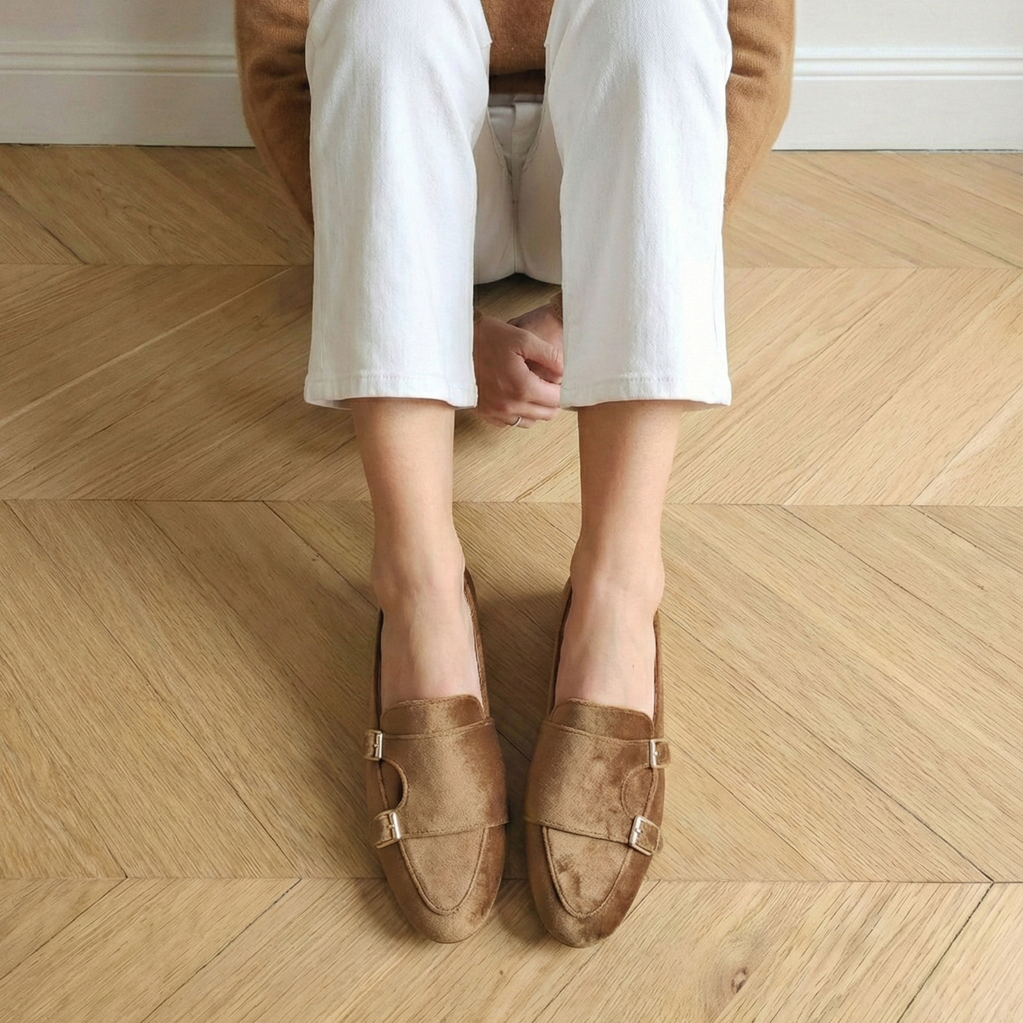 Luce Dorata: L'accostamento tra il velluto ambrato e l'oro delle fibbie crea un contrasto cromatico regale, perfetto per illuminare i mesi autunnali e invernali.