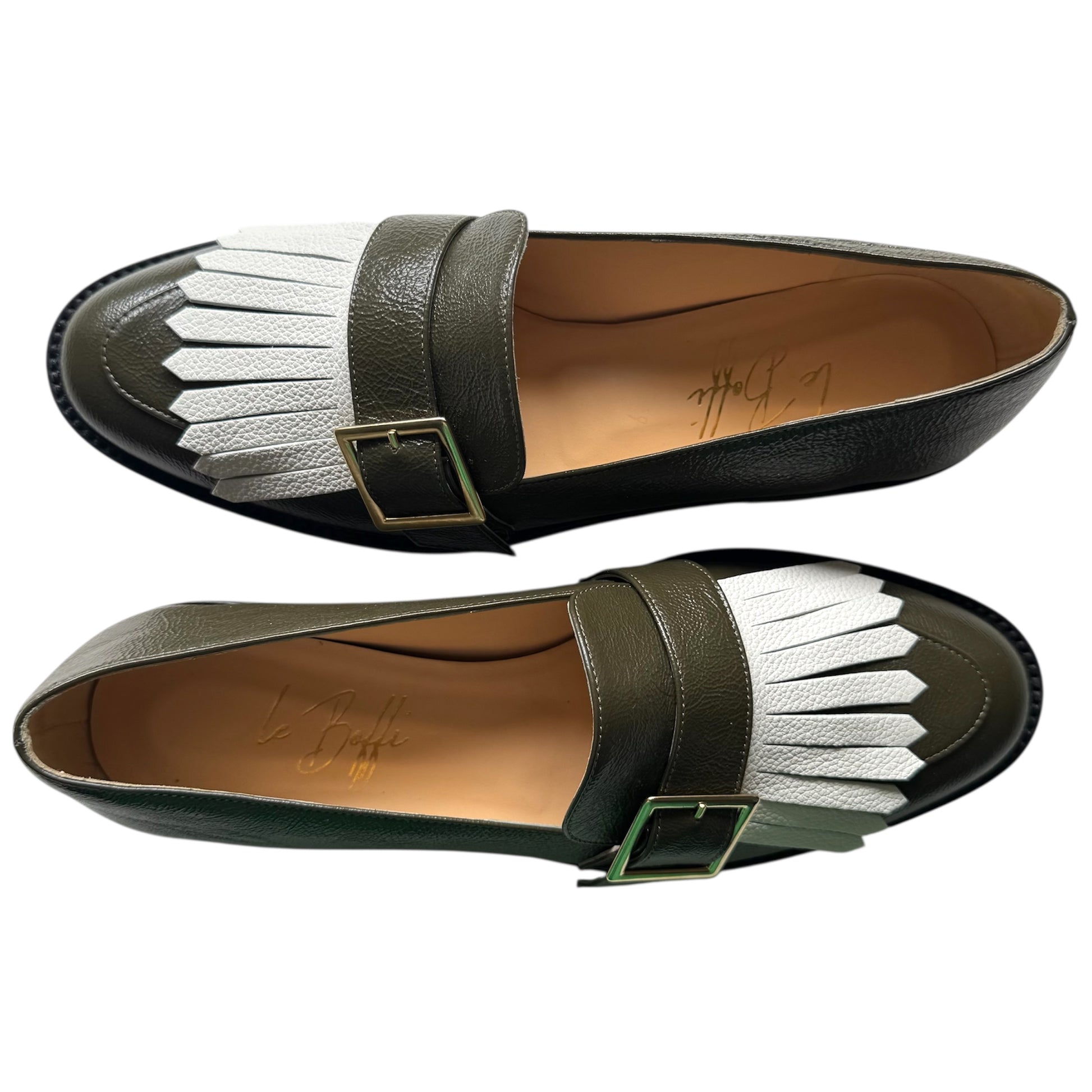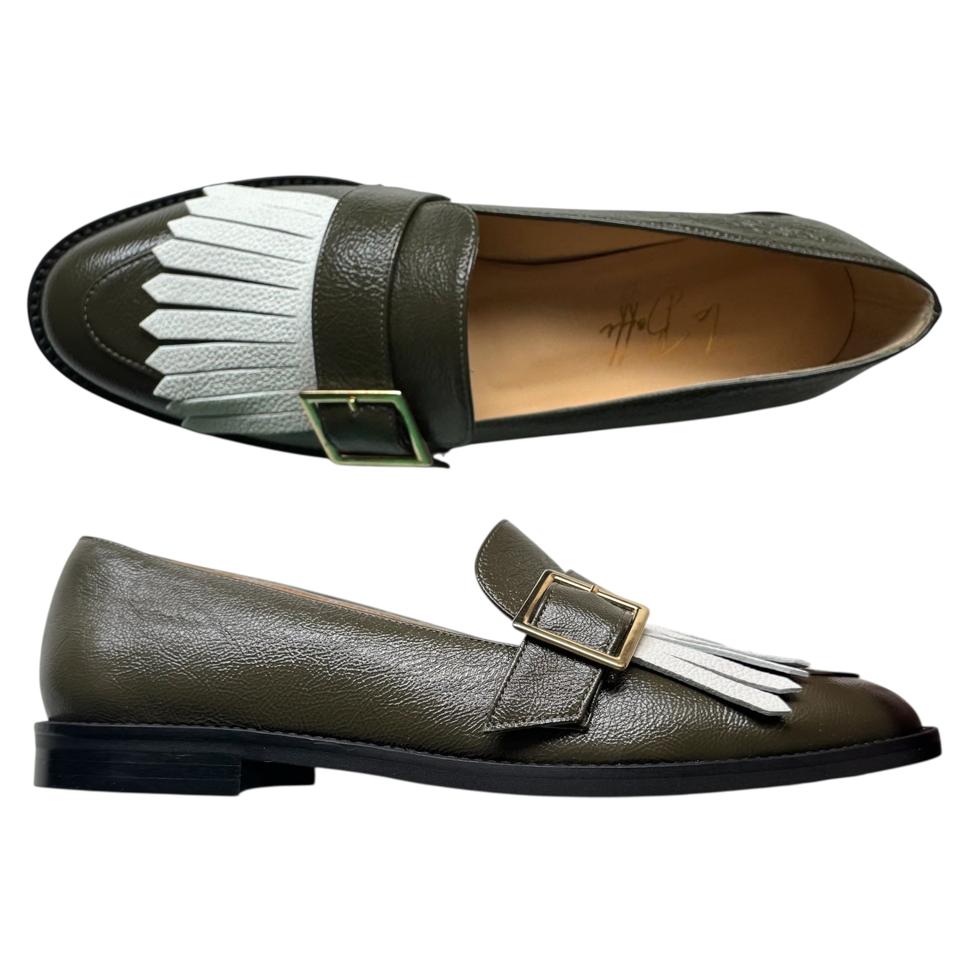 Mocassino a punta tonda in pelle lavorata verde oliva e frangia in martellato bianco