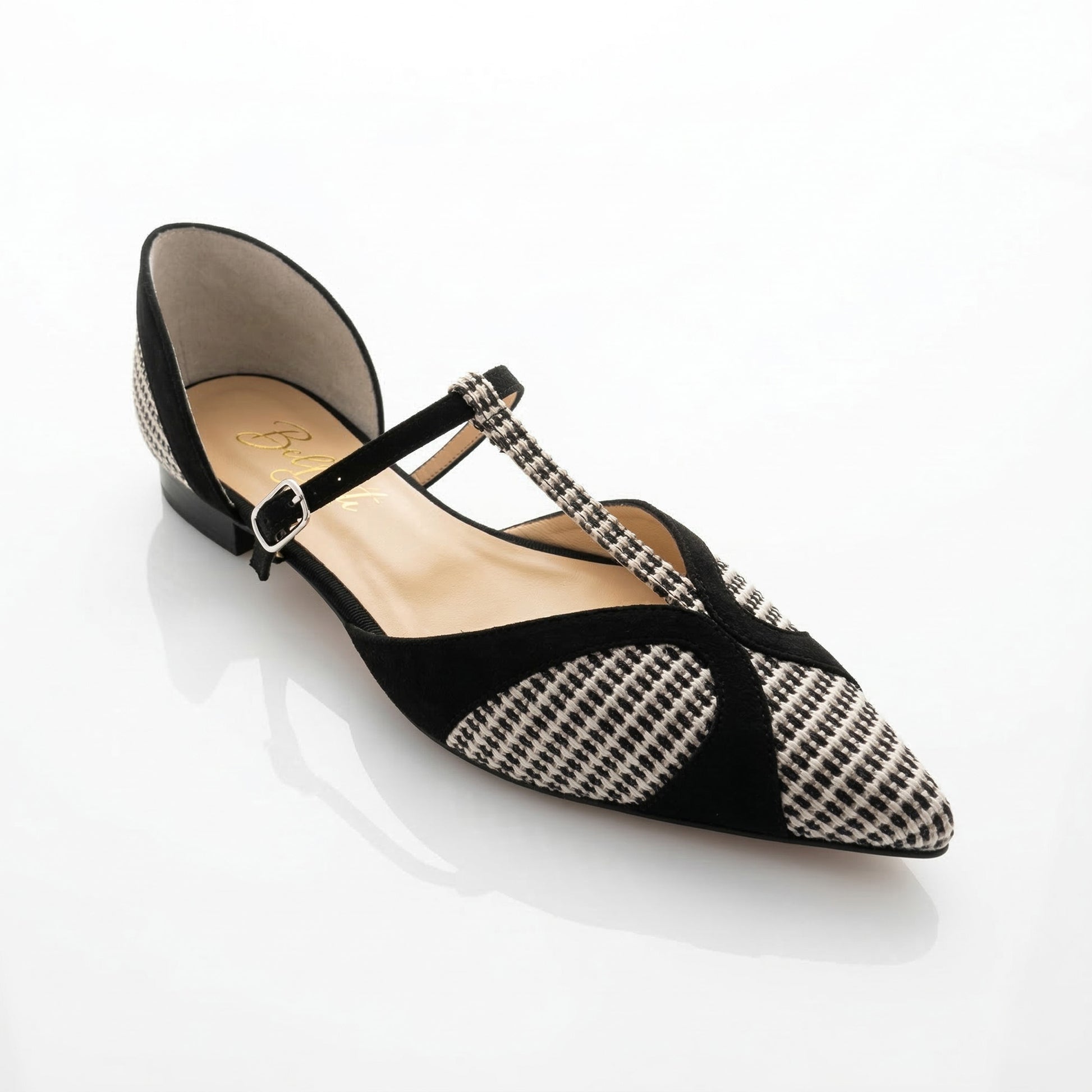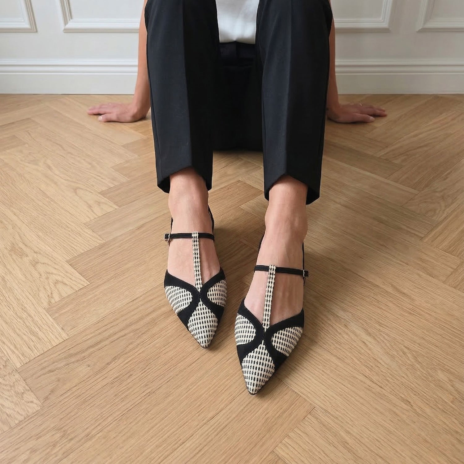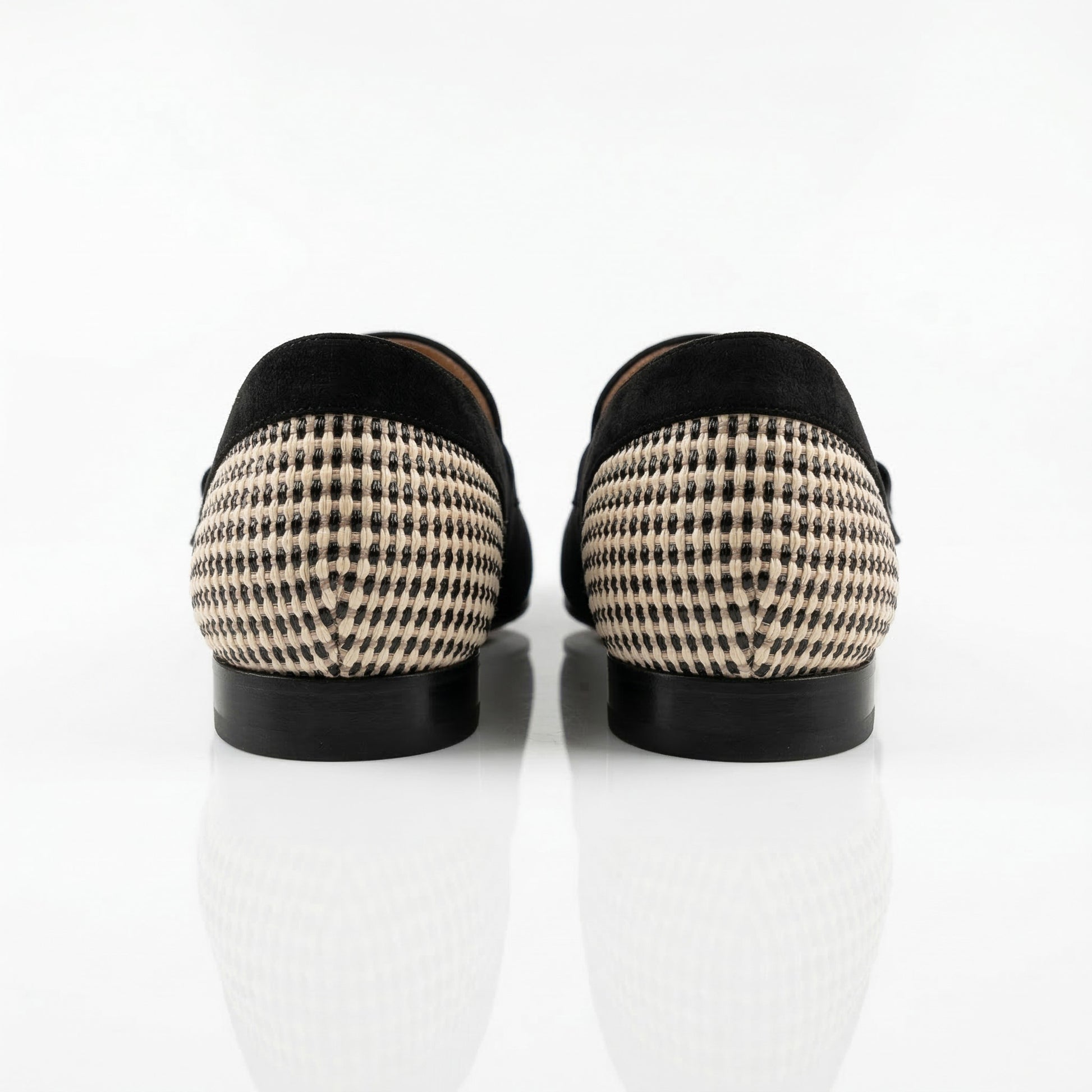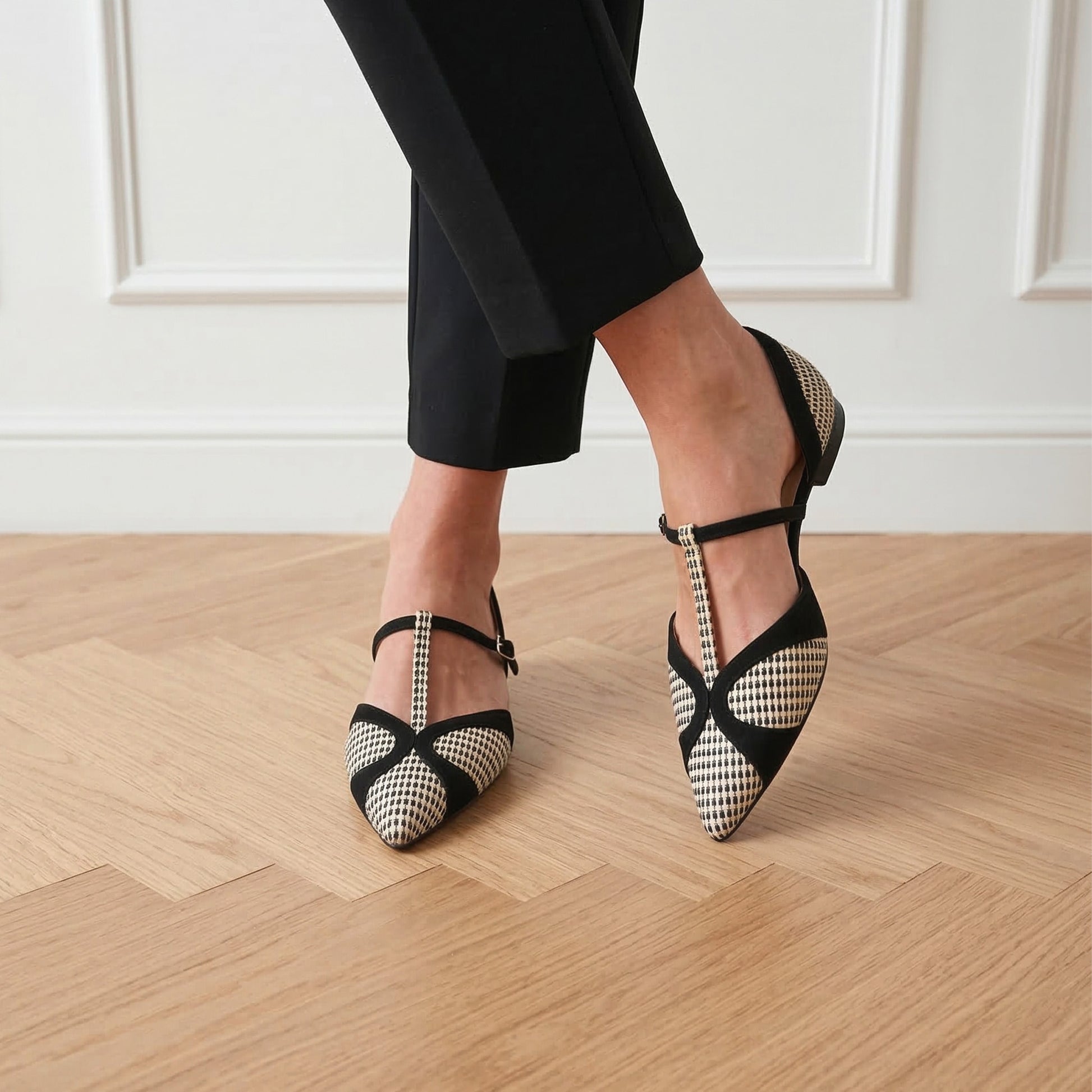 La tomaia è realizzata in pregiata rafia intrecciata con un motivo a micro-quadretti bianco e nero, che dona alla scarpa una tridimensionalità visiva unica e una piacevole leggerezza. I profili, il tallone e il caratteristico sistema di cinturini a "T" sono rifiniti in morbido camoscio nero, che incornicia il pattern geometrico e aggiunge una nota di profondità e rigore stilistico.