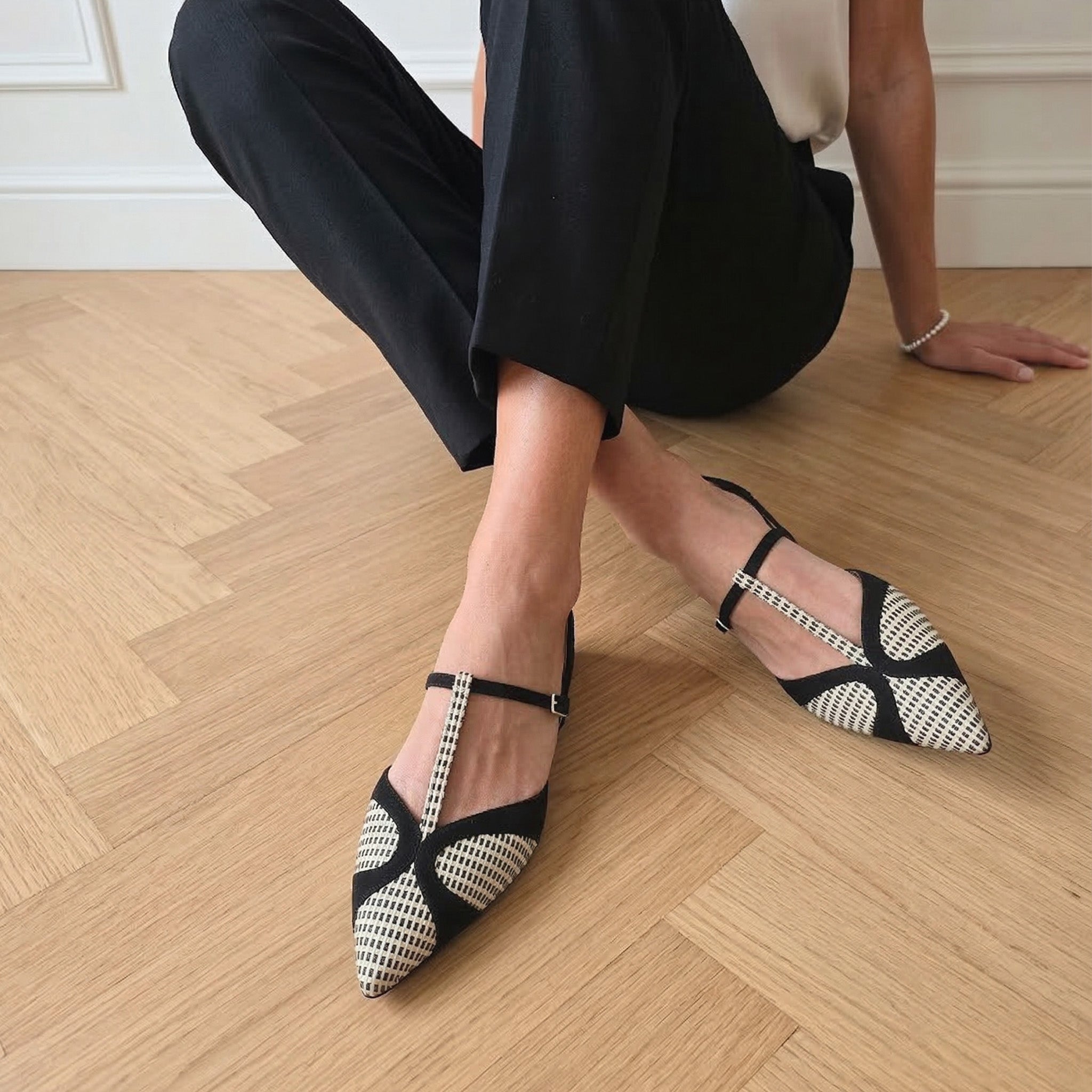 La tomaia è realizzata in pregiata rafia intrecciata con un motivo a micro-quadretti bianco e nero, che dona alla scarpa una tridimensionalità visiva unica e una piacevole leggerezza. I profili, il tallone e il caratteristico sistema di cinturini a "T" sono rifiniti in morbido camoscio nero, che incornicia il pattern geometrico e aggiunge una nota di profondità e rigore stilistico..