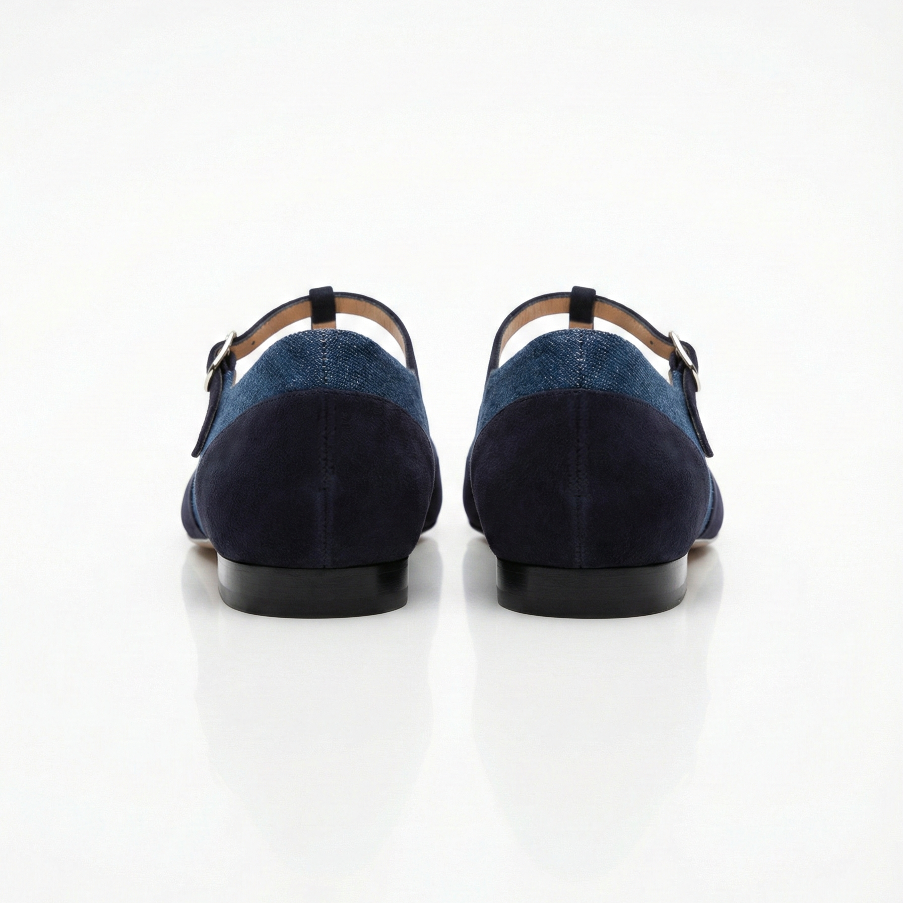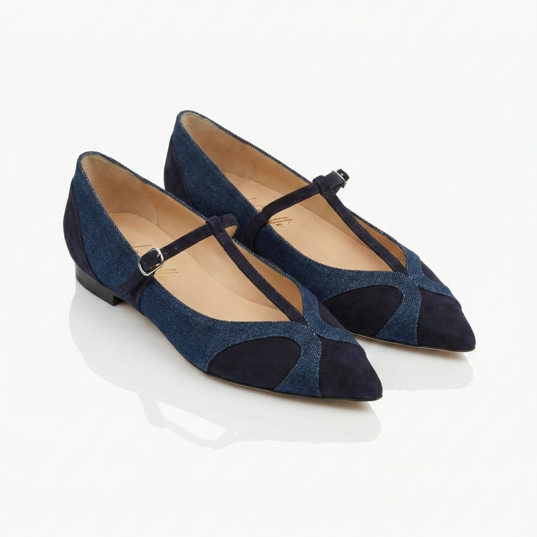 Versatile, dinamica e intrisa di una raffinatezza contemporanea: Vittoria è la ballerina pensata per la donna che vive la città con eleganza spontanea. Questo modello celebra l'incontro tra texture diverse, unendo la praticità del jeans alla morbidezza tattile del camoscio blu, in un gioco di contrasti che profuma di stile parigino.